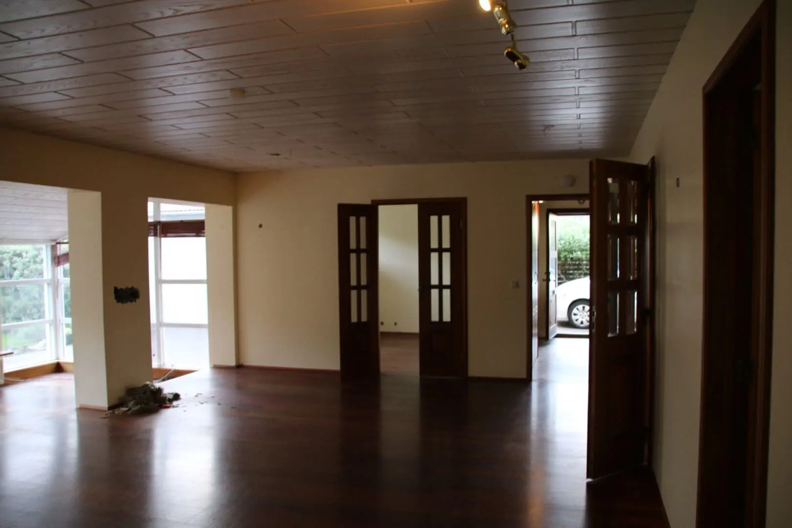 Tvöfalda hurðin inn í eldhús var tekin og hurðaropið stækkað. Við létum svo sérsmíða fyrir okkur tvöfalda franska glerhurð.