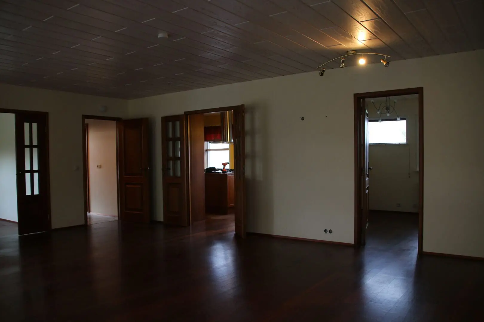 Við tókum niður þessar tvær hurðir og lokuðum alveg vinstri hurðinni og þar er nú heill veggur. Hurðargatið inn í forstofuna var stækkað og tókum við niður vegginn upp í loft fyrir ofan hurðina.