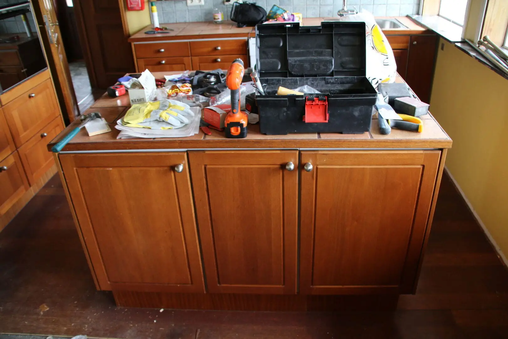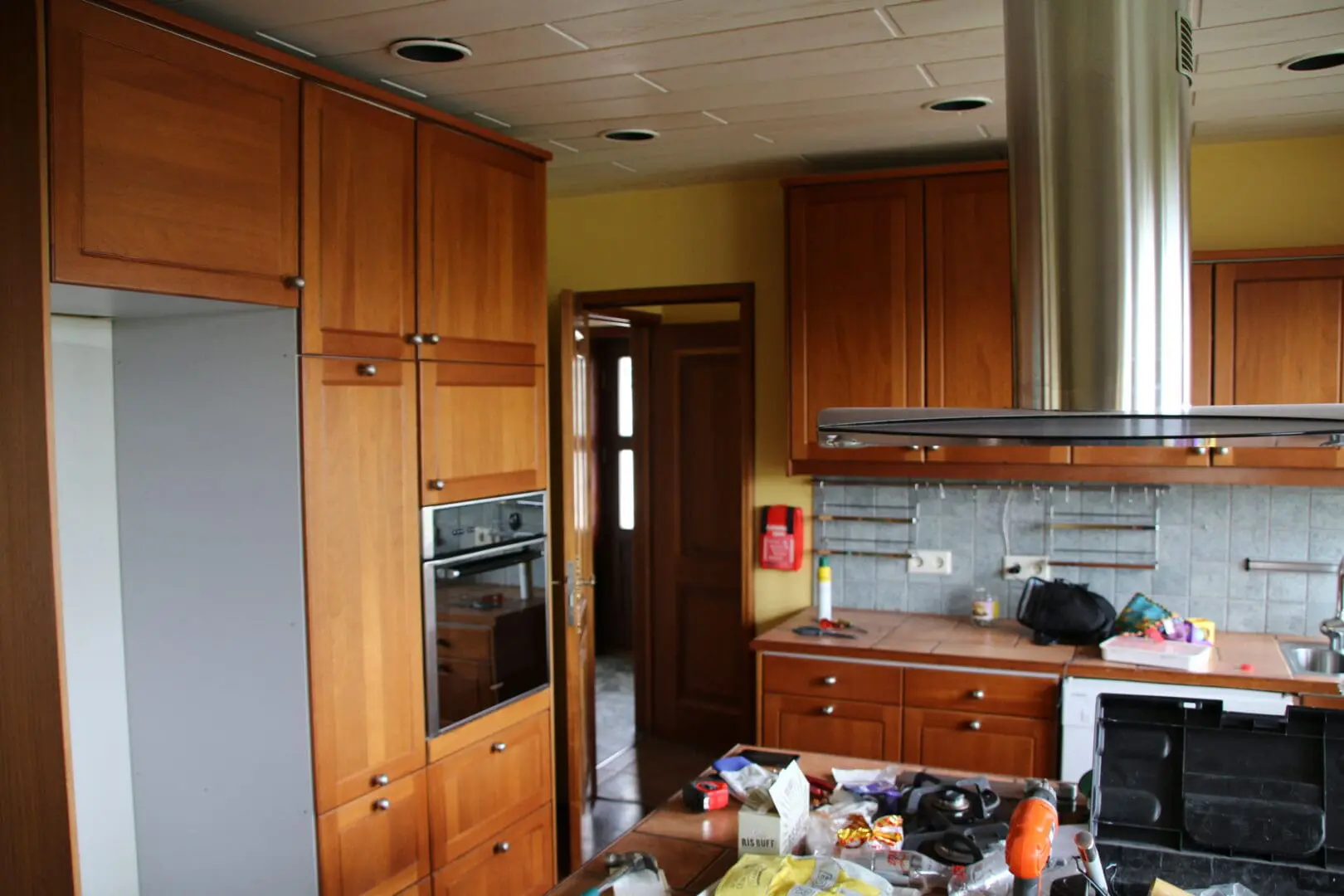 Stóra innréttingin vinstra megin var tekin niður og ofninn færður undir gaseldavélina. Hurðargatinu inn í þvottahús var lokað og ísskápshólfi bætt við enda innréttingarinnar.