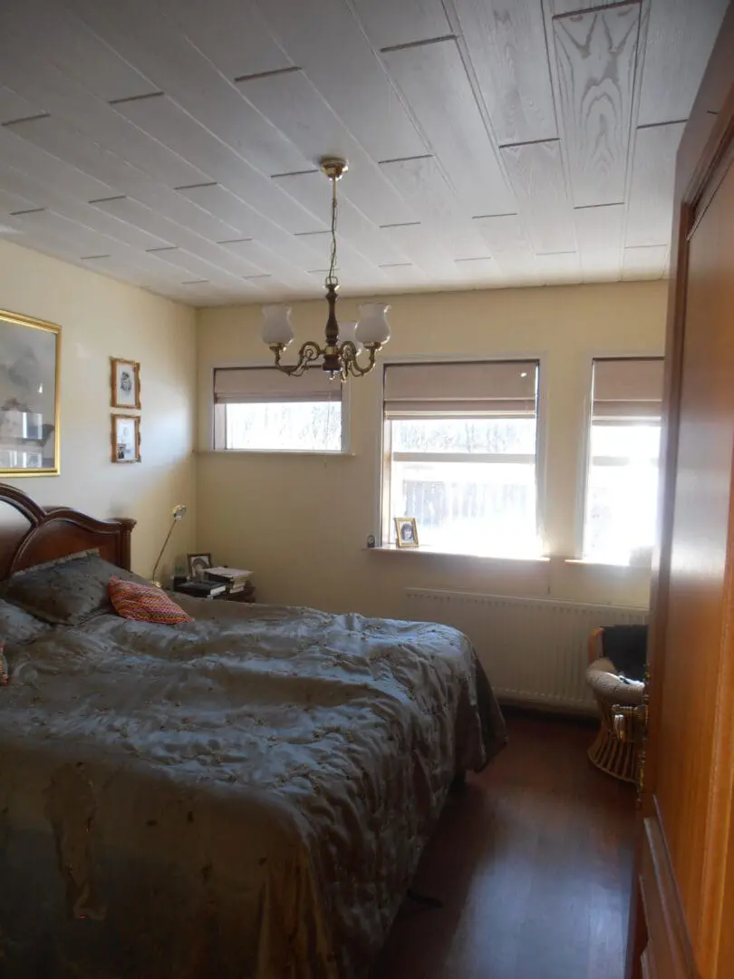 Í hjónaherberginu voru skápar þvert yfir herbergið frá hurð að glugga, og voru þeir allir fjarlægðir. Við settum upp hentugri og fallegri skáp bakvið hurðina.