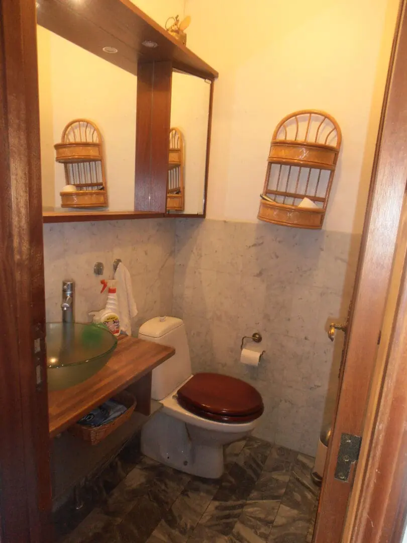 Eyddum engu í gestabaðið, tókum niður speglainnréttingar, máluðum borð og gólf og skiptum um klósettsetu.