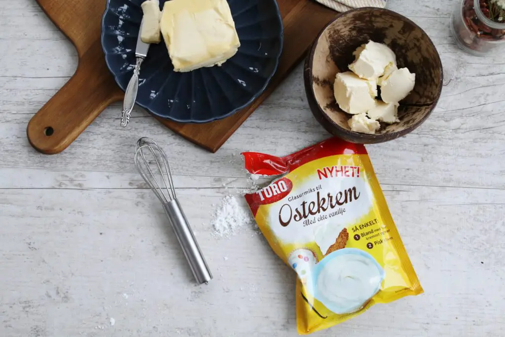 - Takið næst út rjómaost og smjör og leyfið að standa á borði meðan deigið hefast til að það verði mjúkt