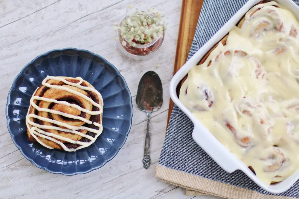 Ef þið viljið gera stóra kanilsnúða eins og á bláa disknum, þá er deigið skorið aðeins þynnra og snúðum raðað á bökunarplötu. Látnir hefast þar undir stykki í 10 mínútur og bakaðir í 15 mínútur á 190 C°hita. Leyfið svo snúðunum að kólna áður en krem er sett á.