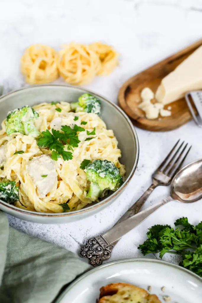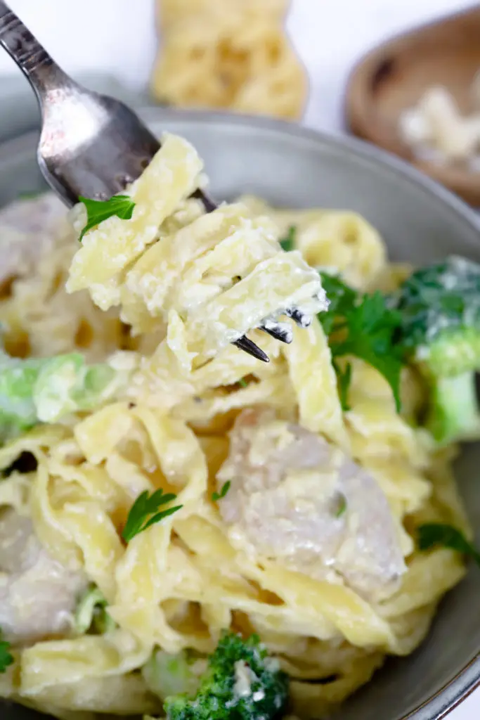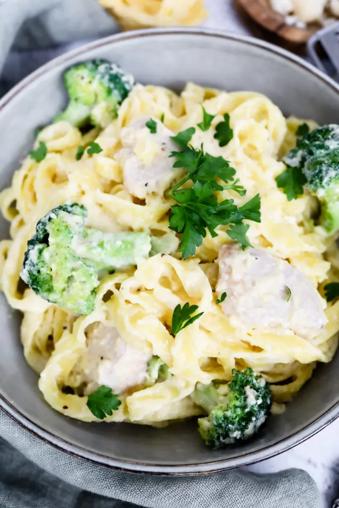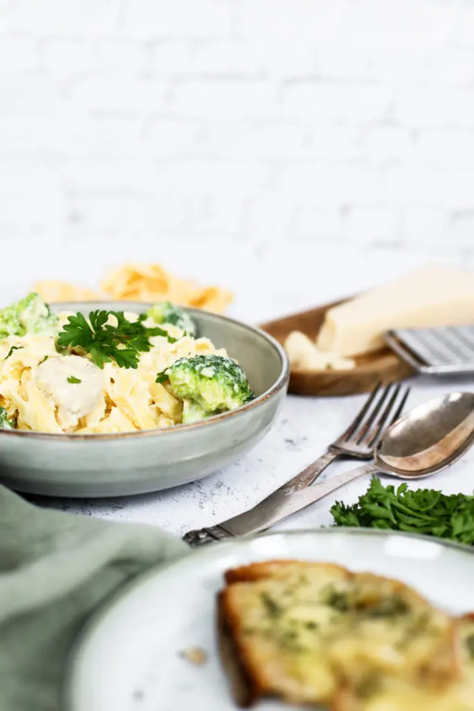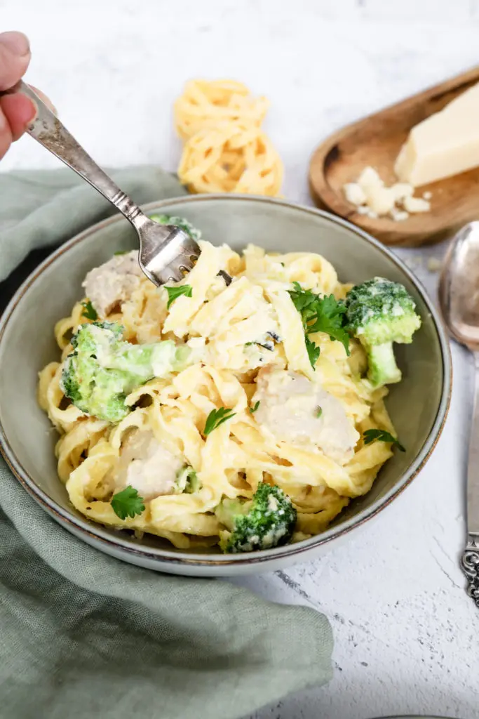 - Setjið kjúklinginn og brokkólíið saman við sósuna og blandið saman