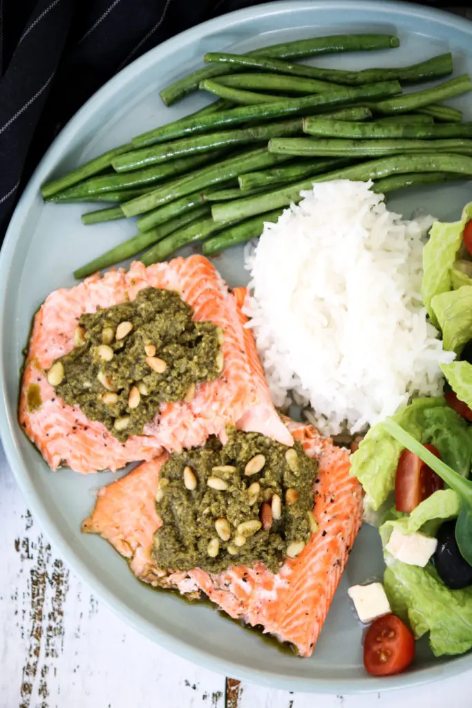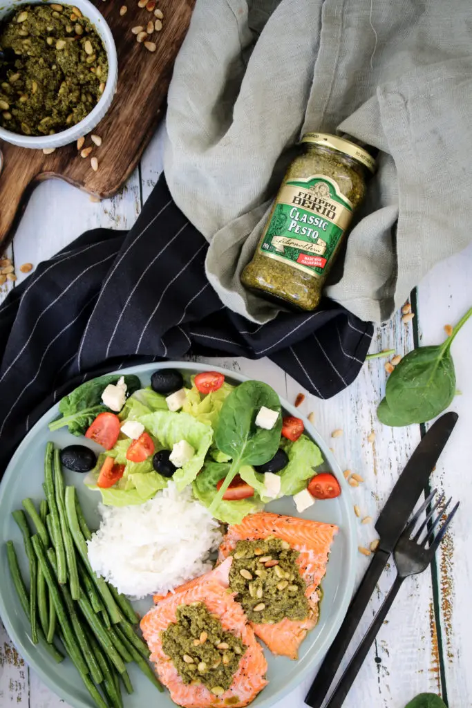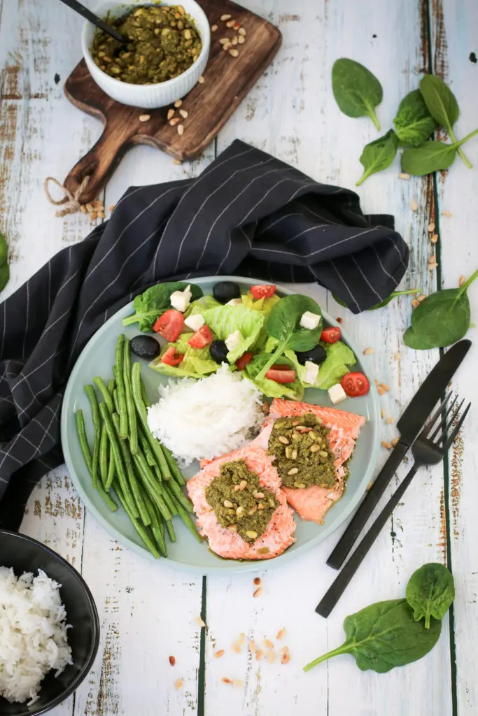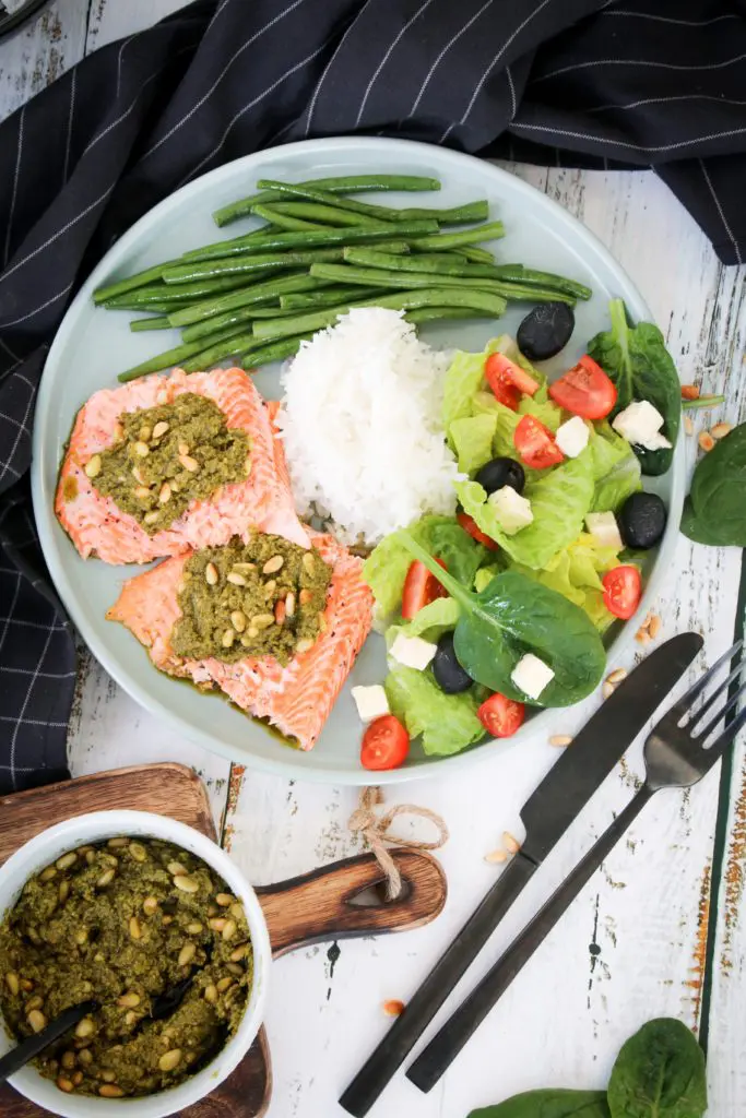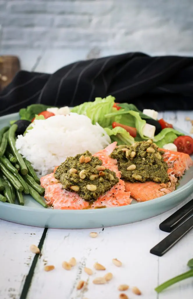 - Berið svo fram flökin sér ásamt pestóinu, grjónum og salati