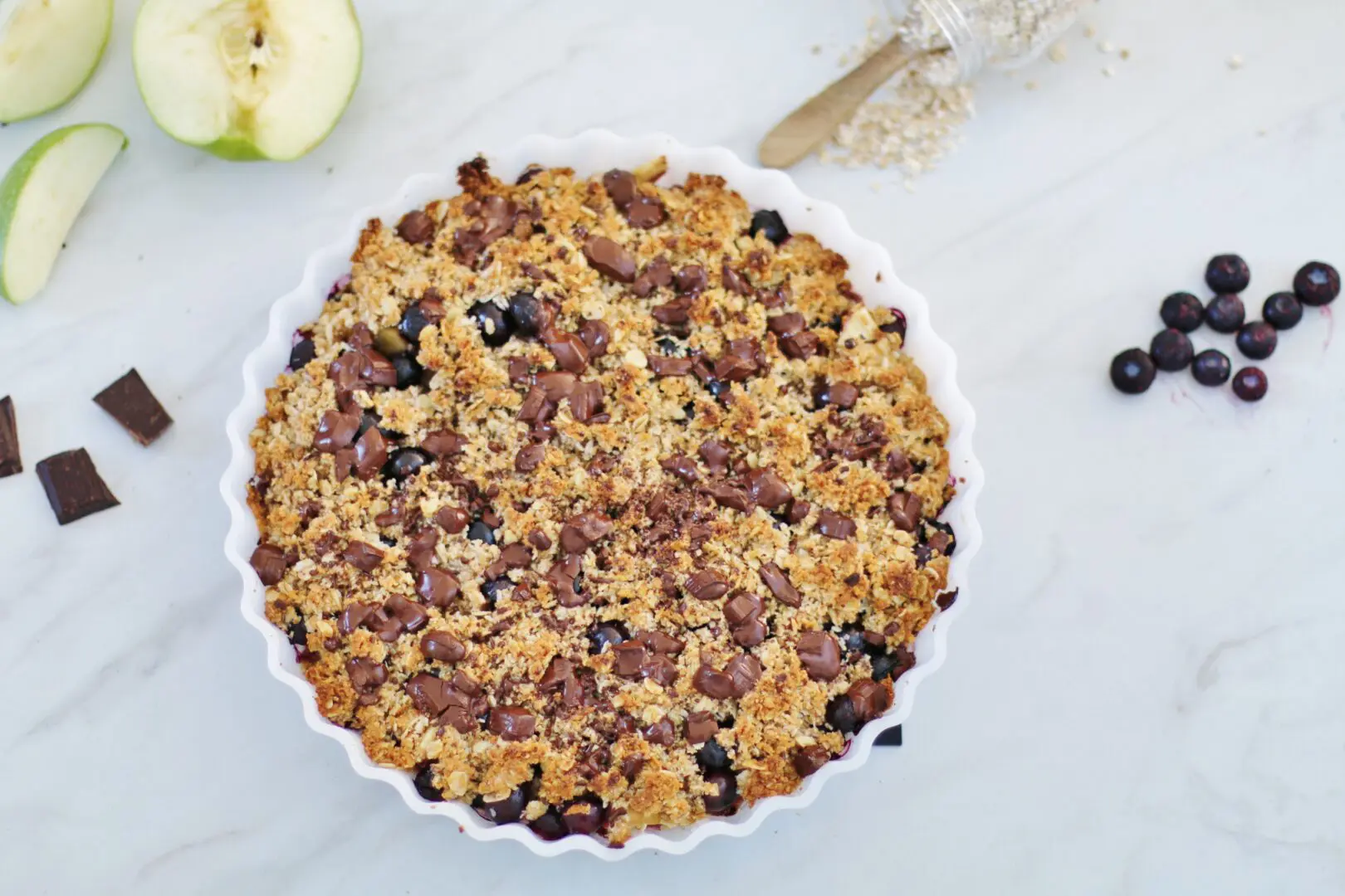 Heit epli, bláber, stökk skorpa og bráðið dökkt súkkulaði borið fram með rjóma…..namm dásamleg blanda. Þessi er ekki lengi að klárast en hún er svooo góð með þeyttum rjóma ofan á.