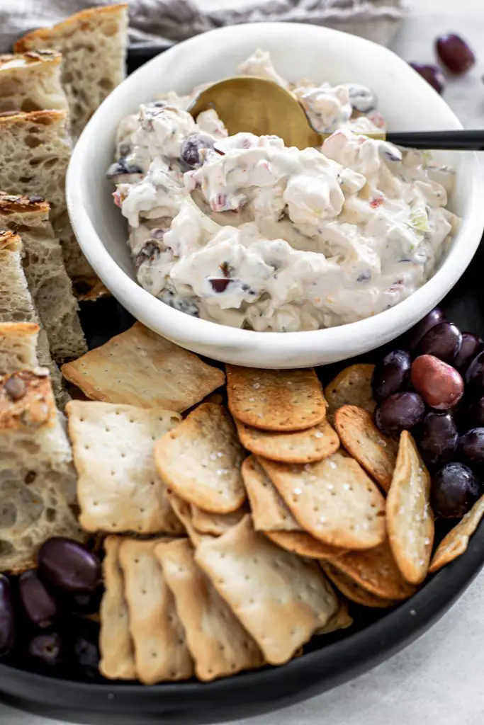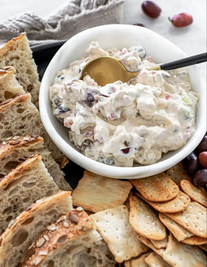 - Setjið svo ostinn, paprikuna, púrrulaukinn og vínberin út í majónesblönduna og hrærið vel