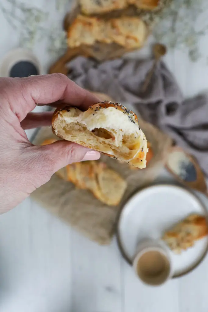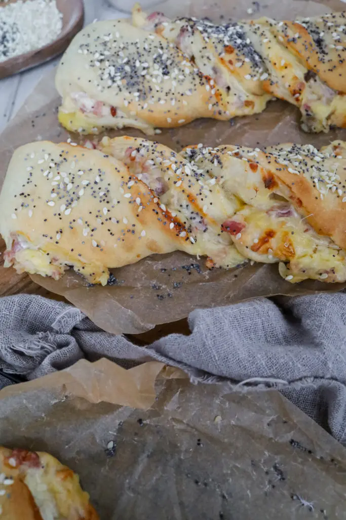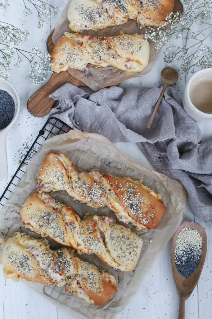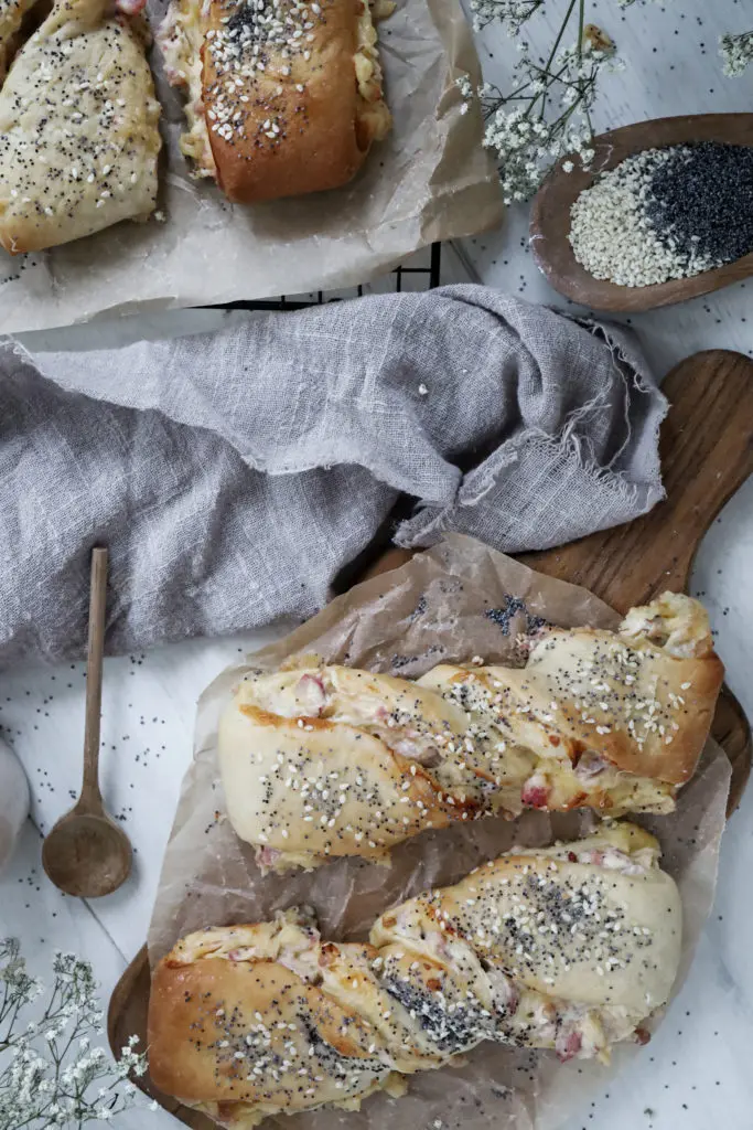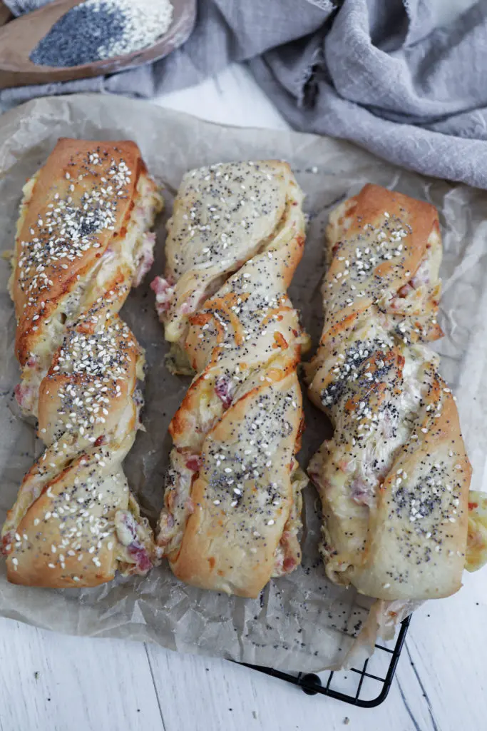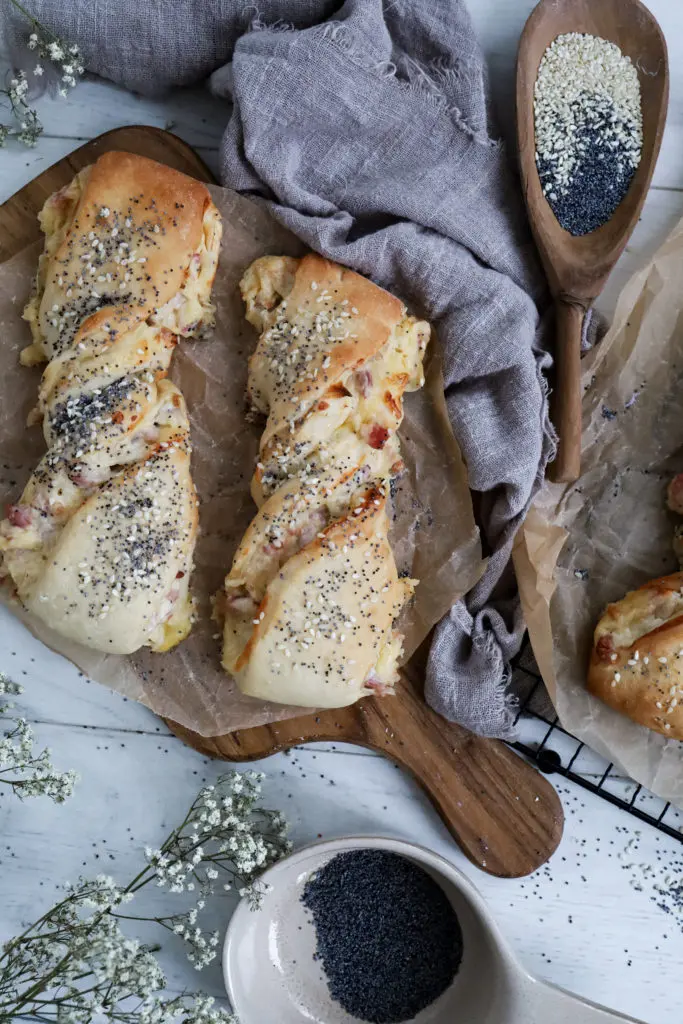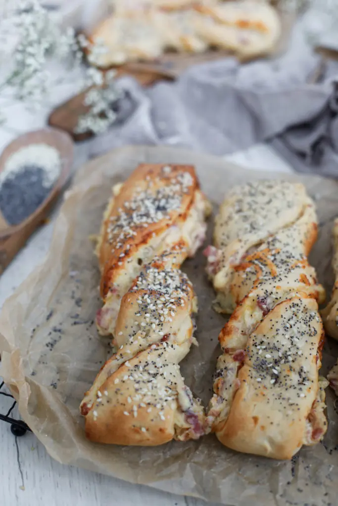 Þær eru stútfullar af skinkumyrju, beikonsmurosti og beikonkurli sem gefur þeim aðalbragðið en í deigið ákvað ég að nota truffluolíu og sveppa soðtening.