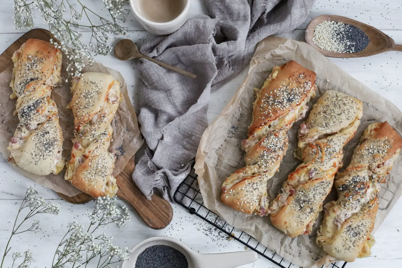 Þær eru stútfullar af skinkumyrju, beikonsmurosti og beikonkurli sem gefur þeim aðalbragðið en í deigið ákvað ég að nota truffluolíu og sveppa soðtening.