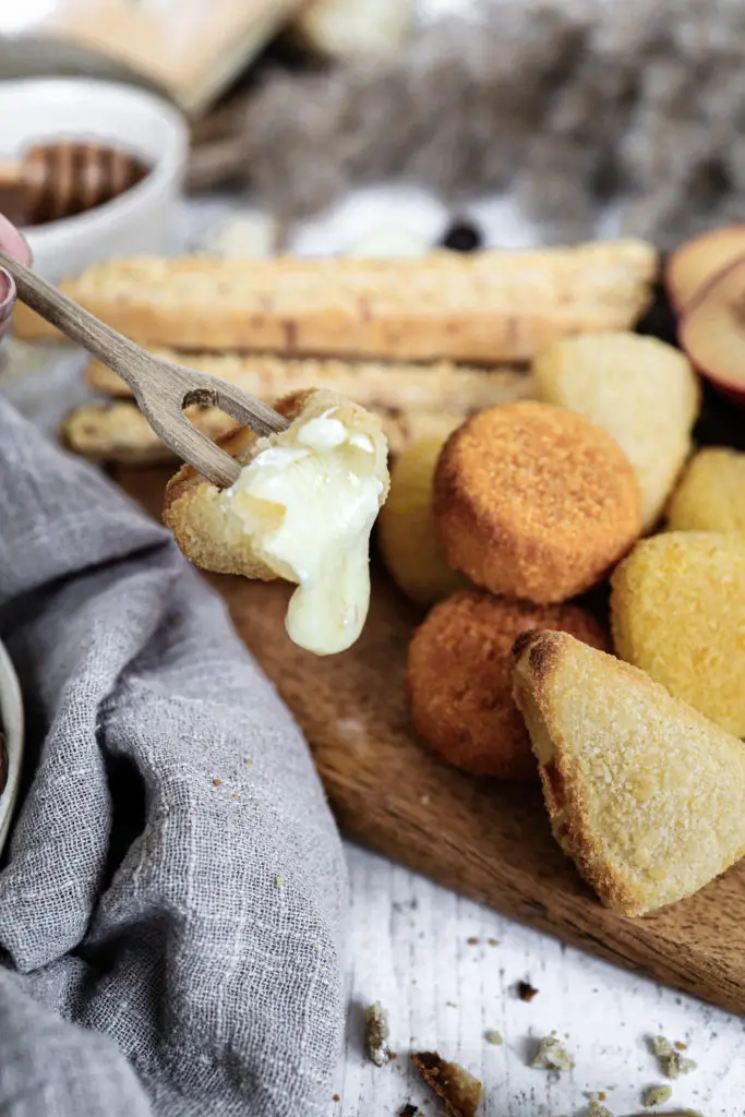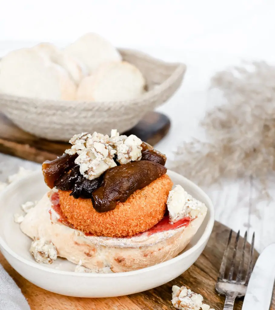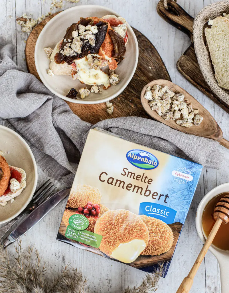 - Setjið heitan djúpsteikta camembert ostinn beint úr ofninum ofan á