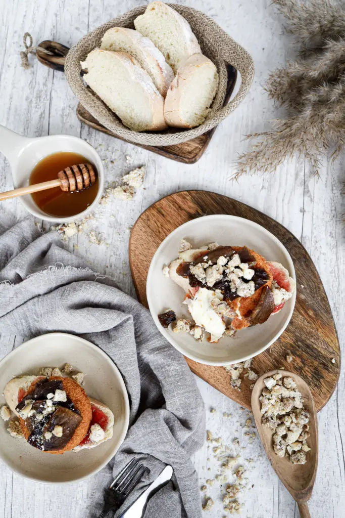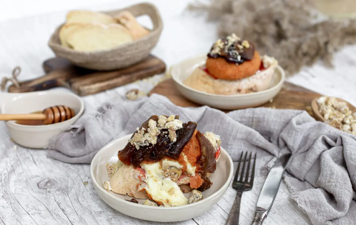 Mín tillaga er að hafa snittubrauð smurt með Den gamle Fabrik rifsberjahlaupi , heilan camambert ofan á, gljáðu eplin þar ofan á og hunangristuðu hneturnar á toppnum.
