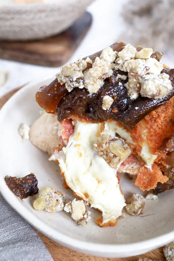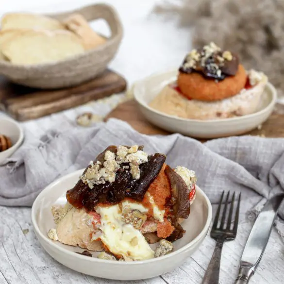 - Gljáðu eplin svo ofan á ostinn og myljið svo hunangsgljáðu hneturnar yfir (gott að nota mortel eða berja á þær með kökukefli)