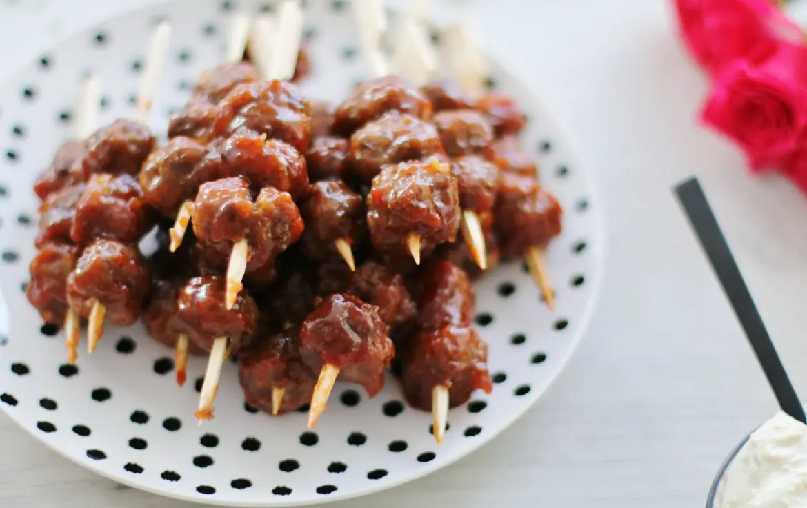 Hver bolla er á stærð við munnbita og því er gott að borða þær með pinna, annað hvort stinga í þær tannstöngli eða pinna eins og þið sjáið á myndinni fyrir ofan.
