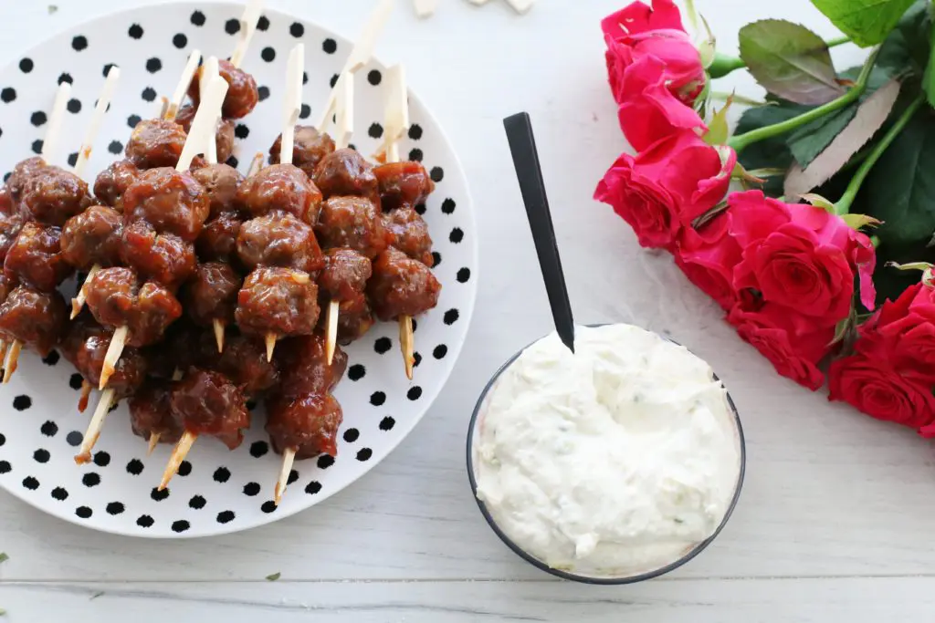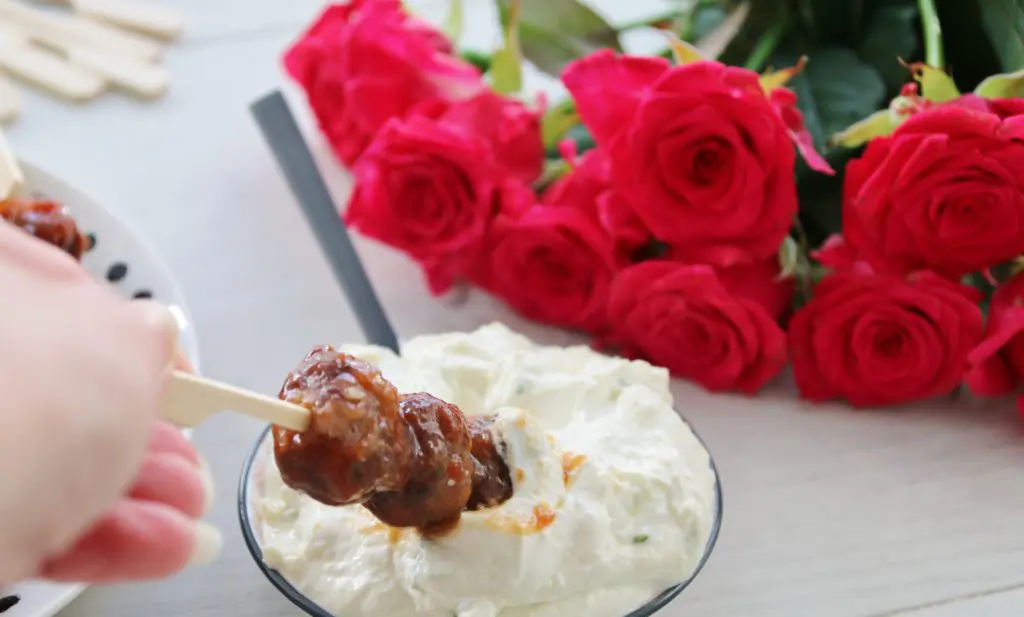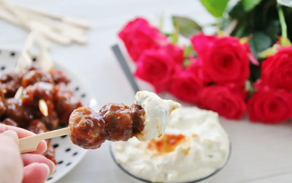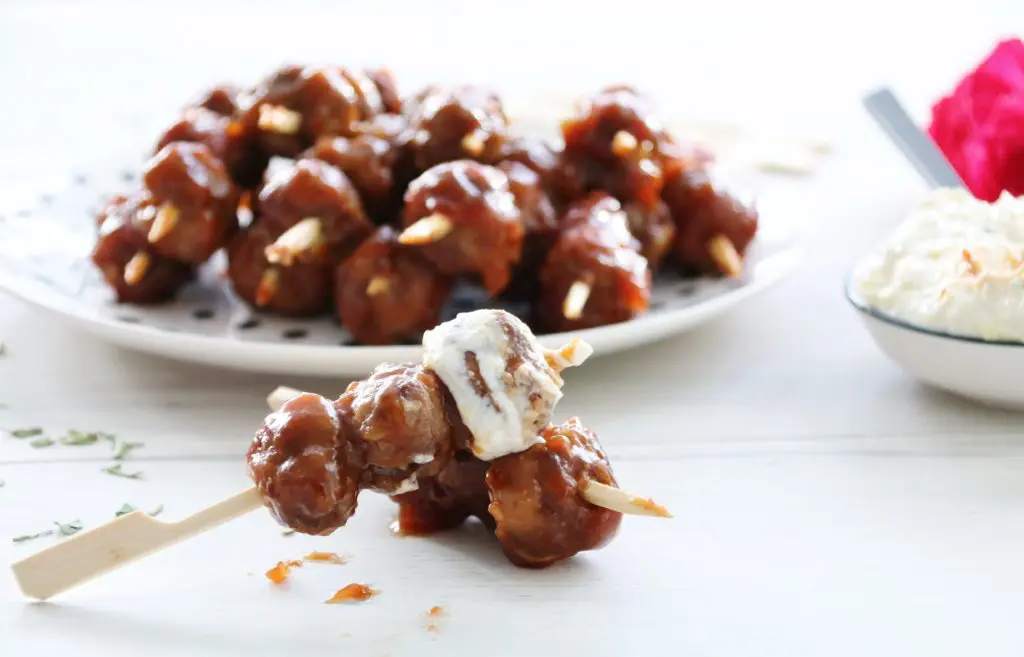 Ef þið eruð með veislu er best að tvöfalda uppskriftina af bollunum og sósunni (ekki af hvítu sósunni samt). Hægt er að bera fram á pinnum eða bara á disk eins og þið sjáið hér að ofa.