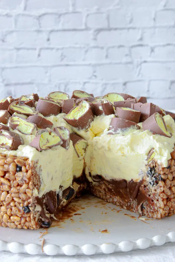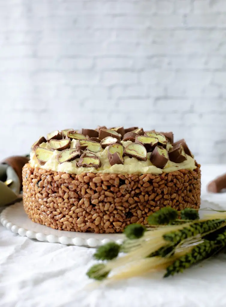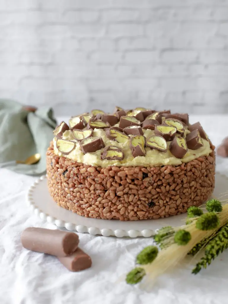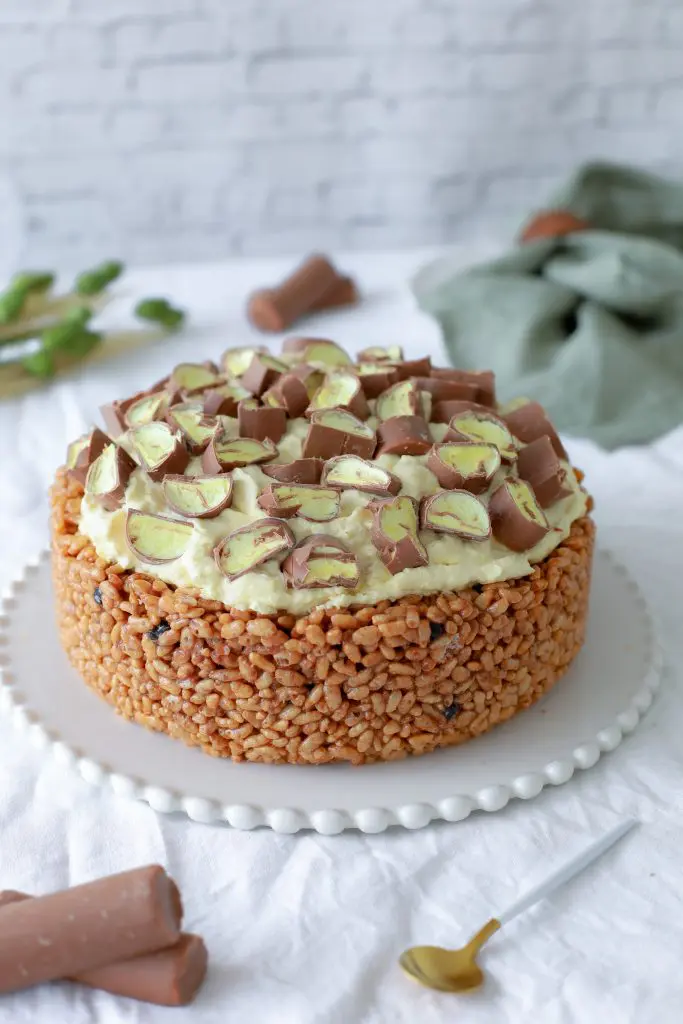 - Takið nú rice crispies botninn úr frystinum og úr mótinu og setjið hann á kökudisk