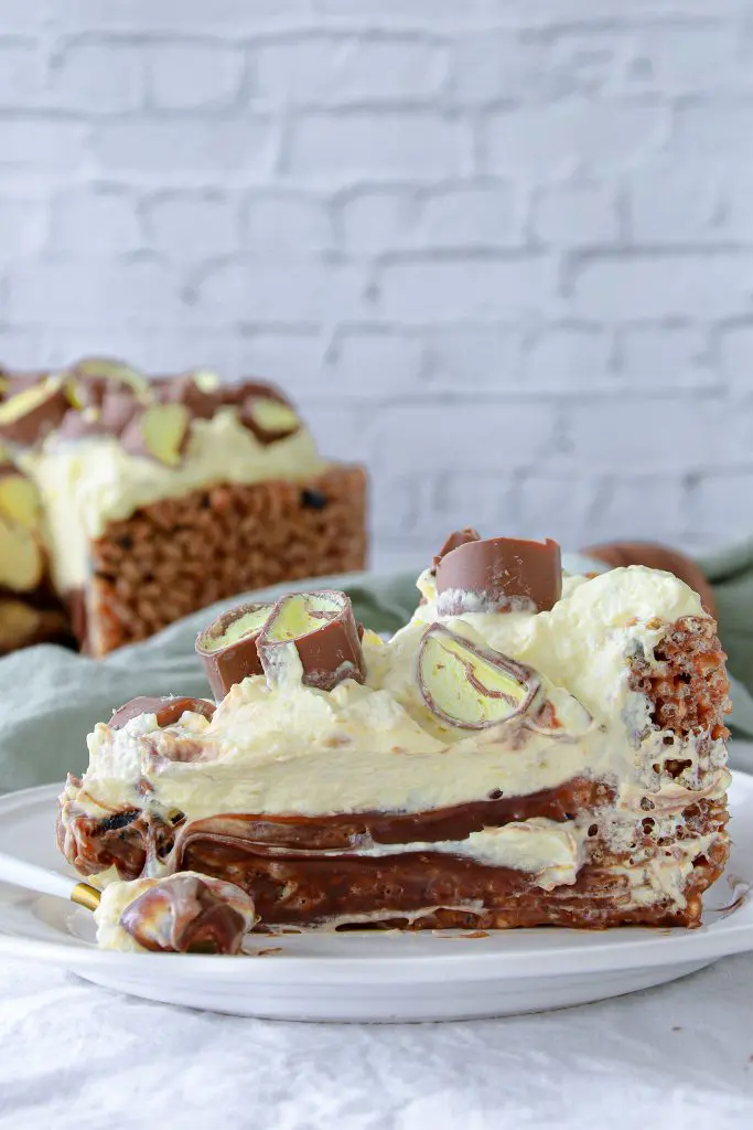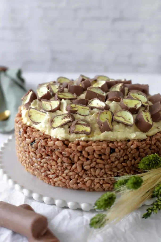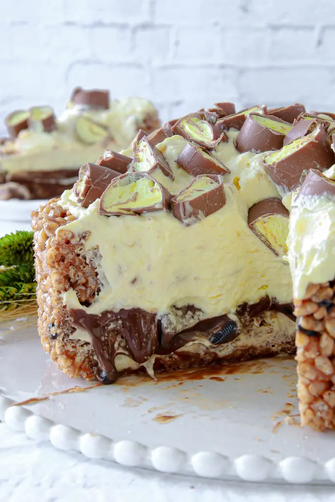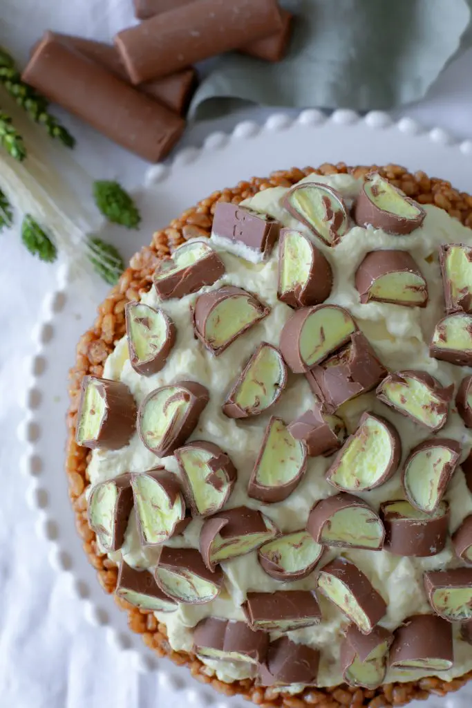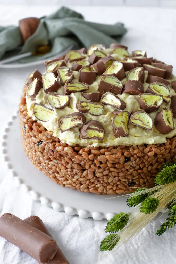 - Takið nú rice crispies botninn úr frystinum og úr mótinu og setjið hann á kökudisk