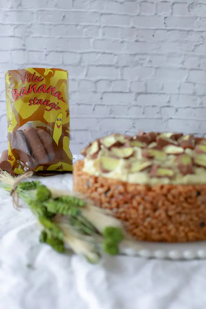 Ég var svo heppin að fá stóra og góða nammisendingu frá tilvonandi samstarfskonu minni, en hún kom með fullt af þristum og Völu bananastöngum sem var innblástur minn af tertunni.