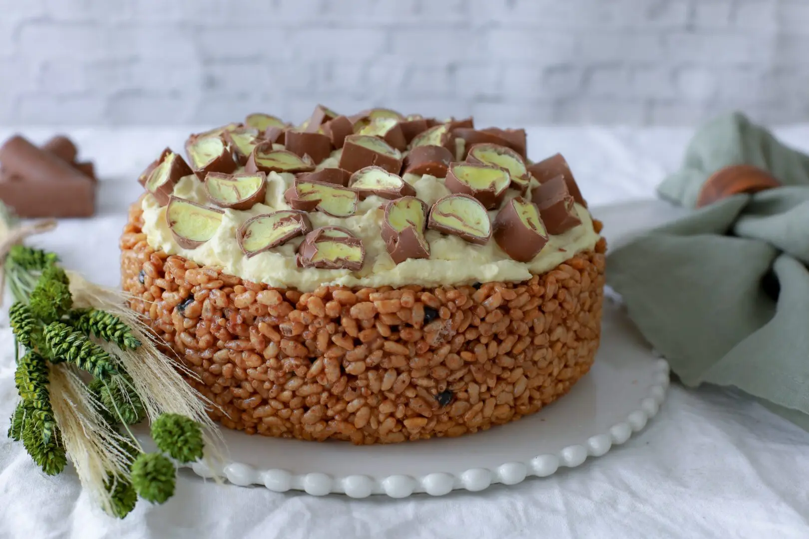 - Takið nú rice crispies botninn úr frystinum og úr mótinu og setjið hann á kökudisk
