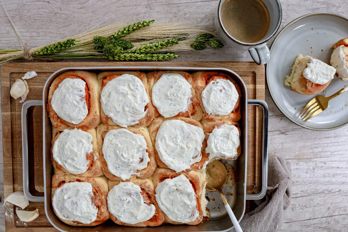 - Takið svo snúðana út og leyfið þeim að kólna í eins og 5-10 mínútur og setjið hvítlauksrjómaostakremið strax yfir og berið fram heita