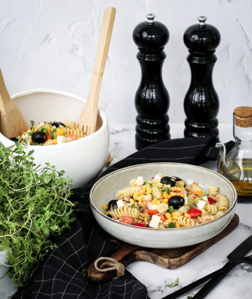 Það góða við kalt pastasalat er að það geymist vel í ísskáp og því hægt að gera stóra skammta af því til að eiga í nokkra daga.