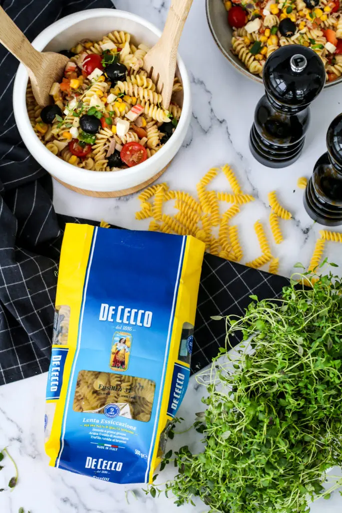Í þetta sinn notaði ég pastaskrúfur frá De Cecco en ástæðan fyrir því vali er að De Cecco pastað klístrast akkurat ekkert né límist saman þegar það kólnar.