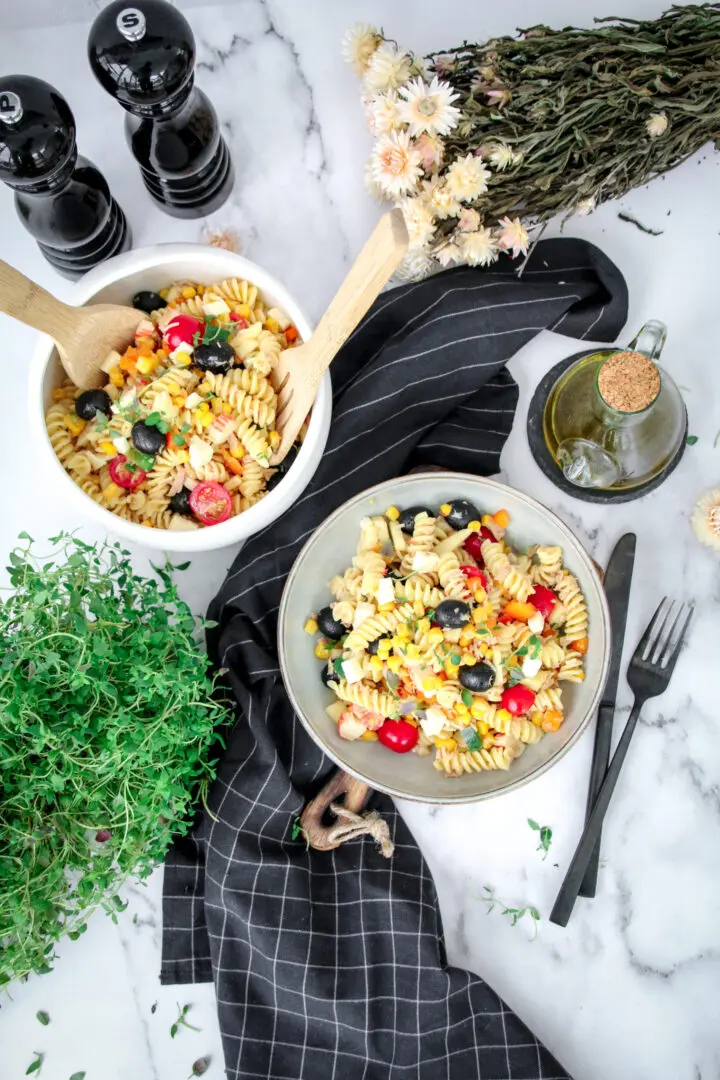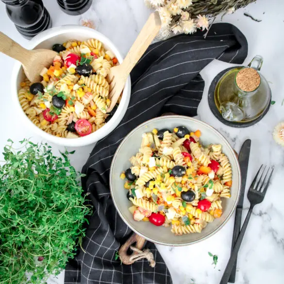 Kalt pastasalat er eitthvað sem margir mættu gera mikið oftar, enda er það ótrúlega sniðugt til að hafa með í nesti eða til að eiga í ísskáp þegar hungur seðjar að og manni vantar eitthvað snöggt.