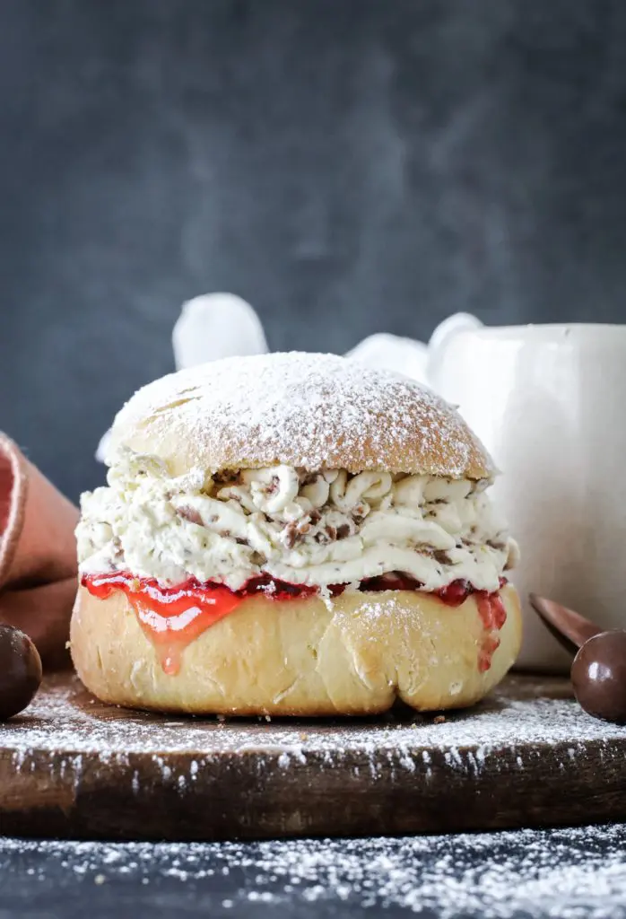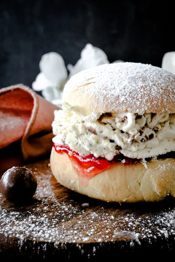- Setjið svo rommrjómann ofan á sultuna og lokið bollunni með efra laginu