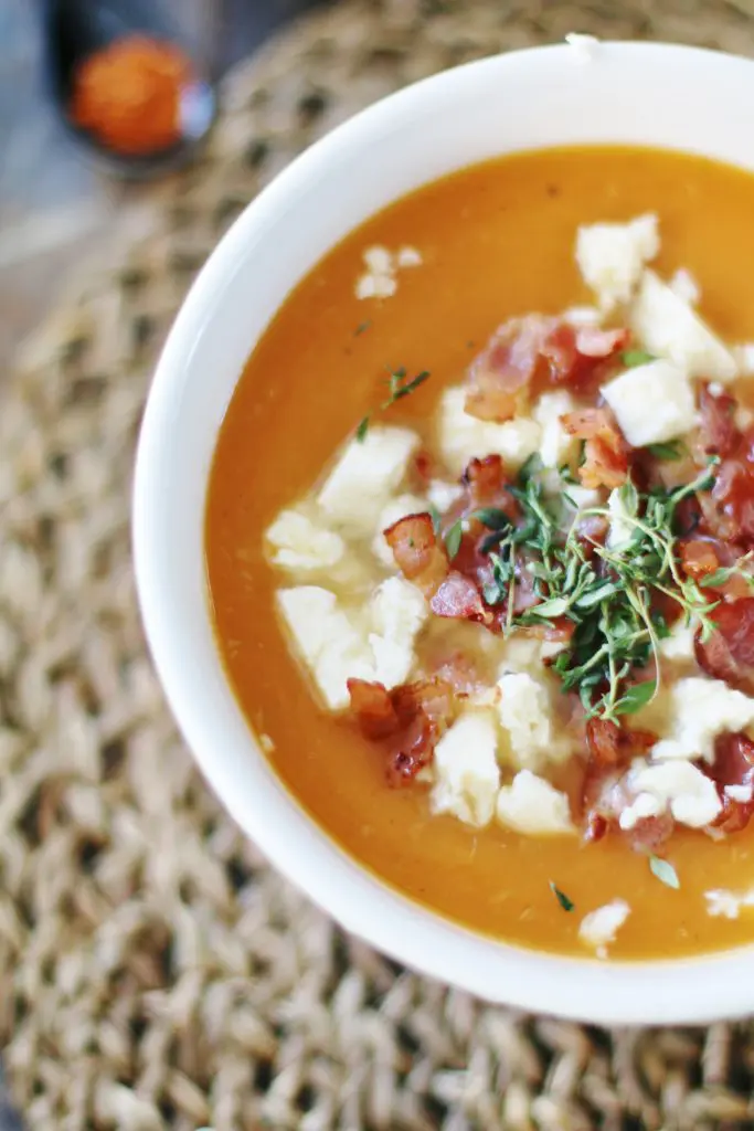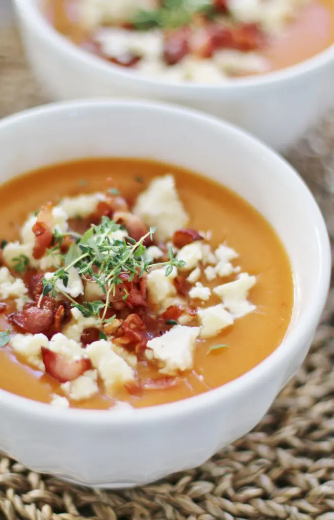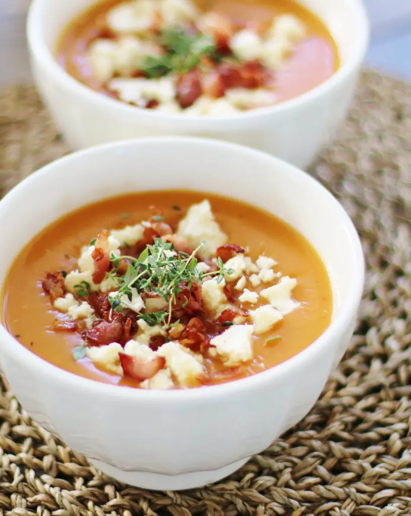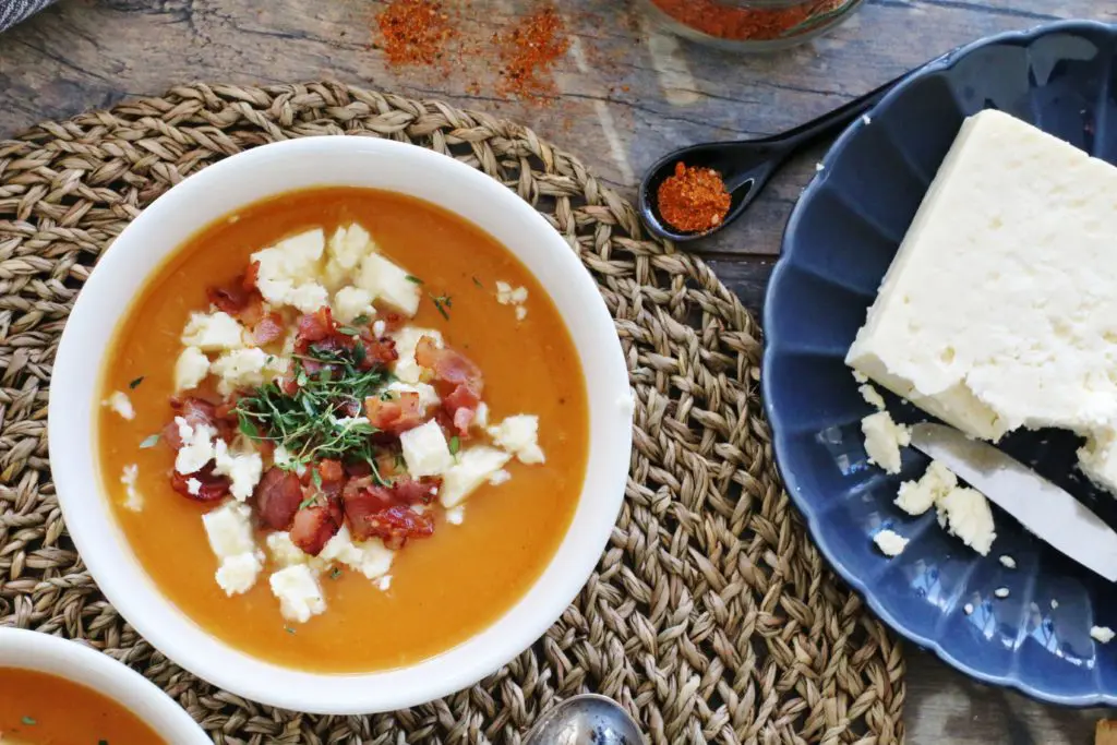Súpan er silkimjúk, krydduð með heitum kryddum sem verma manni frá toppi til táar, toppuð með mjúkum söltum fetaosti, stökku beikoni og ykkar uppáhaldskryddjurtum.