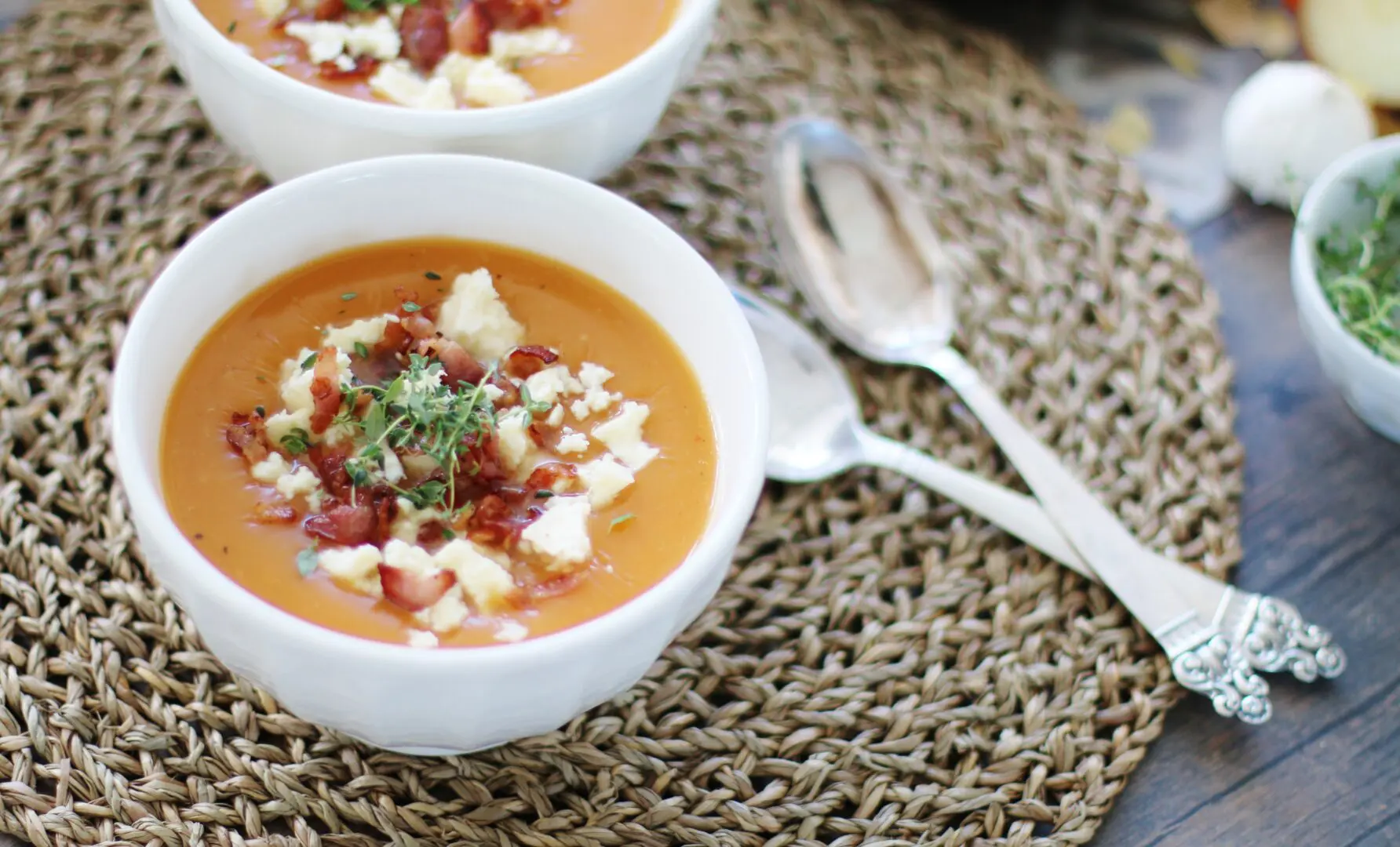 Súpan er silkimjúk, krydduð með heitum kryddum sem verma manni frá toppi til táar, toppuð með mjúkum söltum fetaosti, stökku beikoni og ykkar uppáhaldskryddjurtum.
