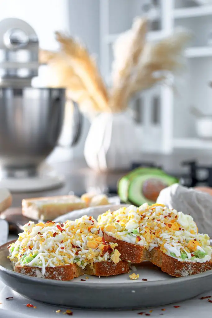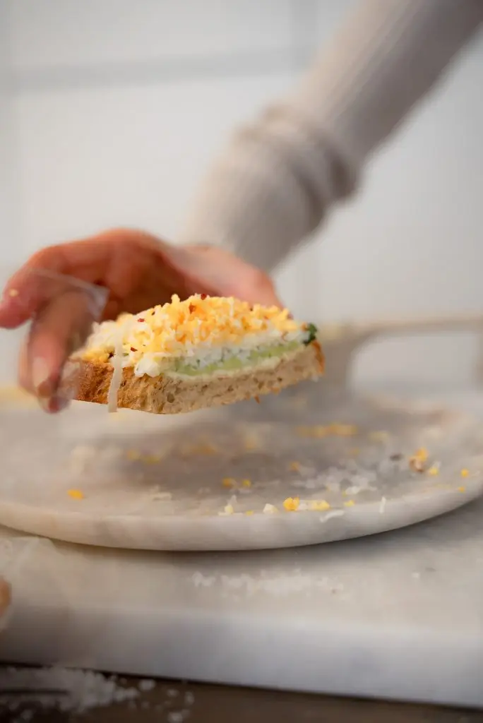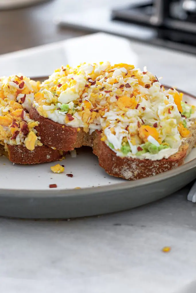 Tillaga númer 4 Vinsæla Tik Tok eggjabrauðið, með rjómaosti, avókadó, röspuðu eggi, parmesan og chilifögum