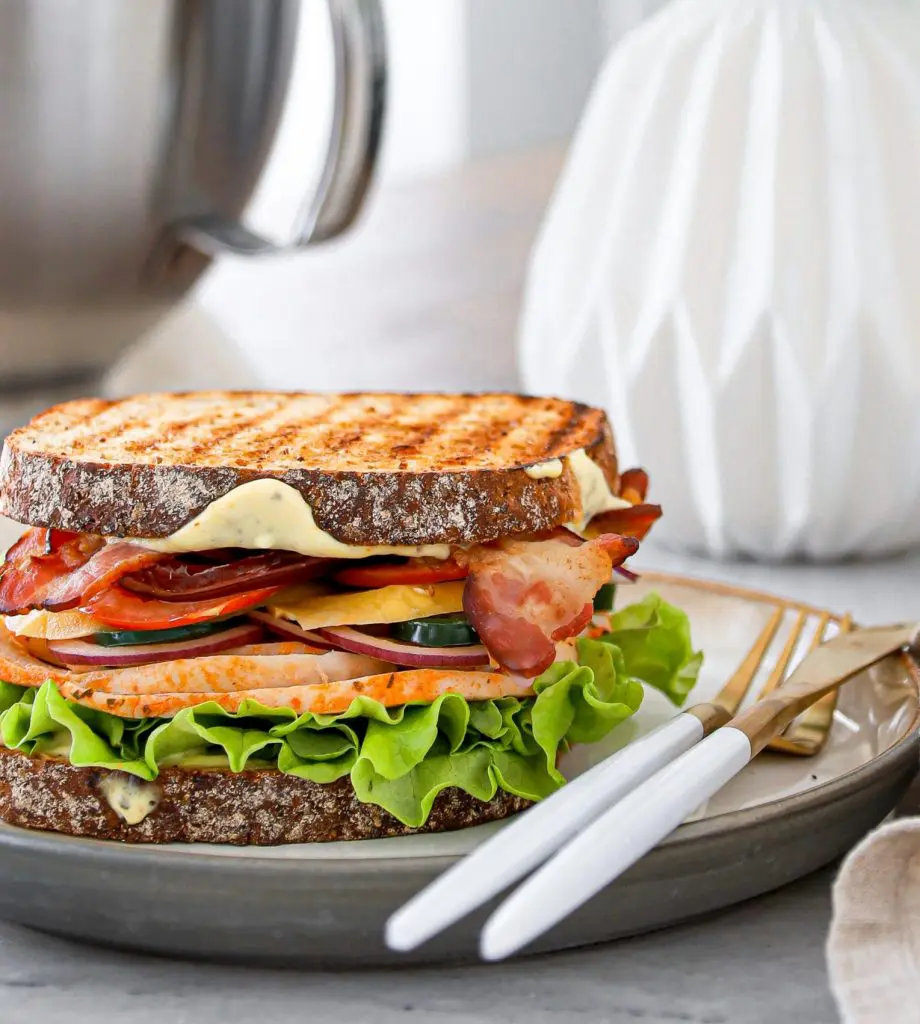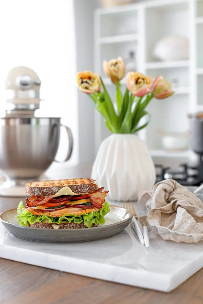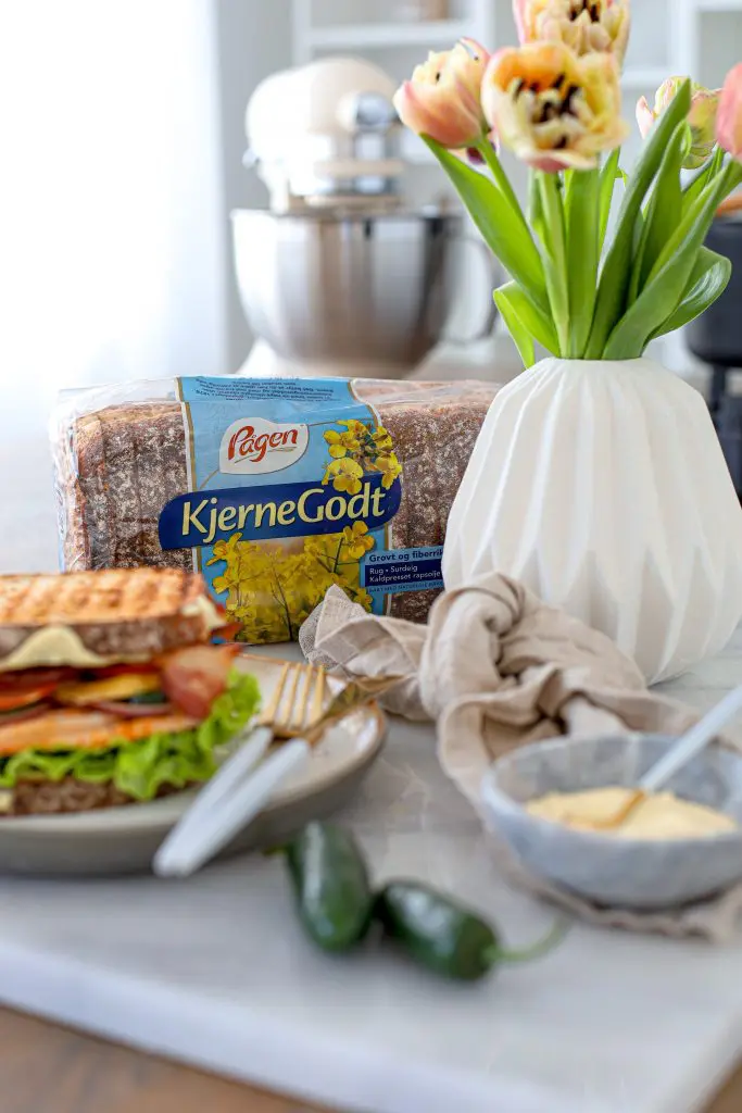 - setjið næst kál, tómata, mangósneiðar, kjúkling, beikon, jalapnejo og rauðlauk á aðra brauðsneiðina og lokið svo með hinni