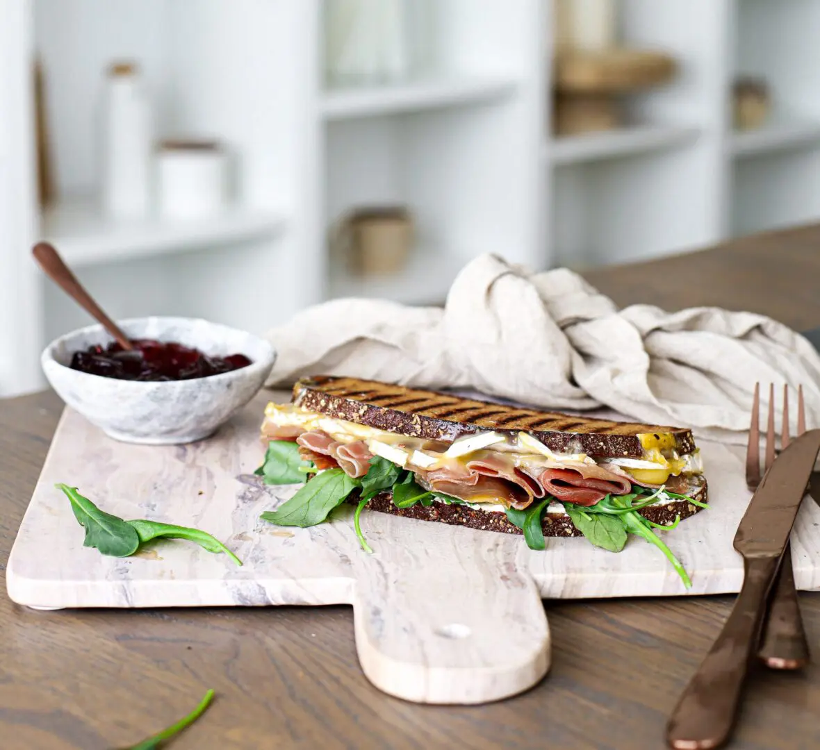 Samloka 2 Grilluð samloka með rjómaosti, camembert, hráskinku og ruccola salati, borin fram með rifsberjahlaupi