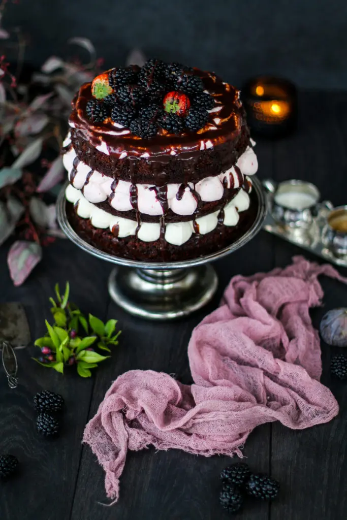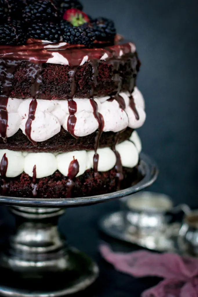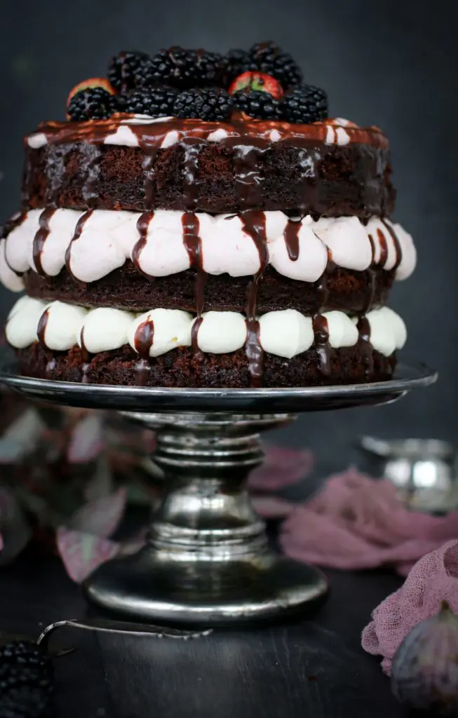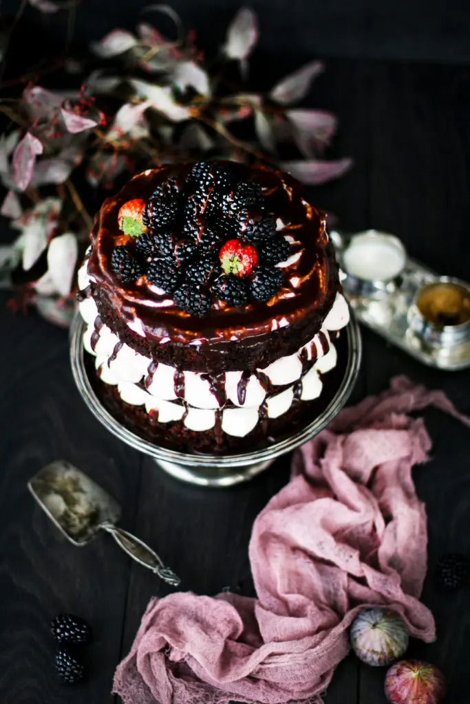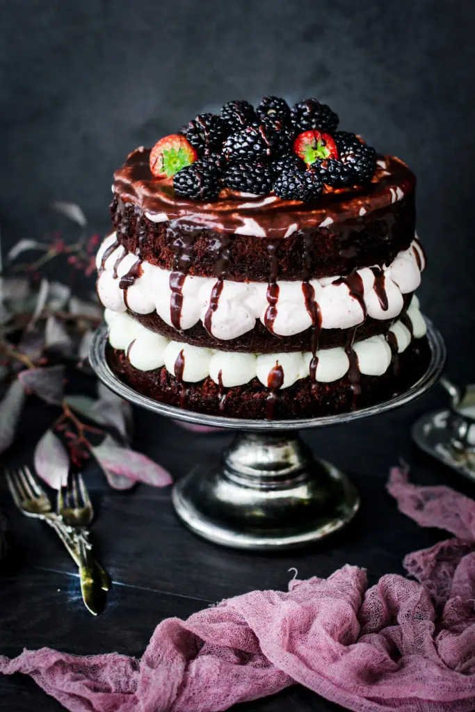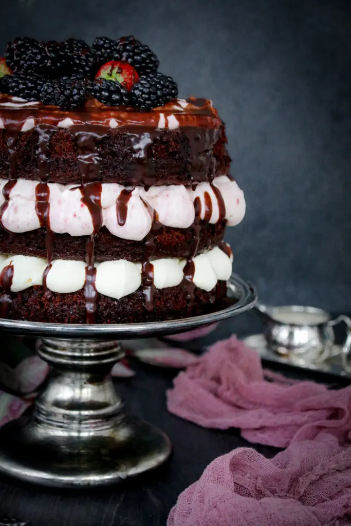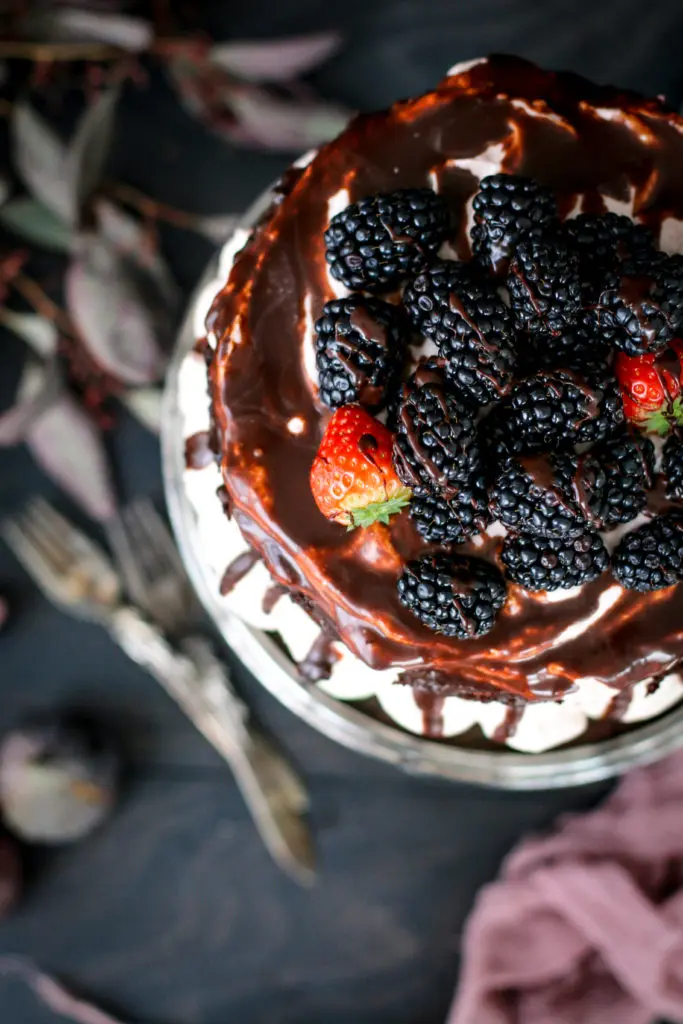 Djúpt súkkulaðibragðið í bland við mjúkan sætan rjómann og ferska jarðaberarjómann er blanda sem getur ekki klikkað, að toppa hana svo með dásamlegri súkkulaðibráð og brómberjum er algjörlega til að gera hana fullkomna.