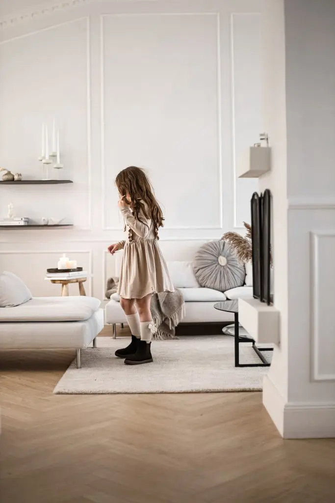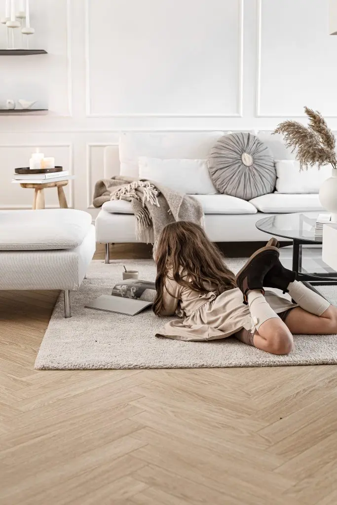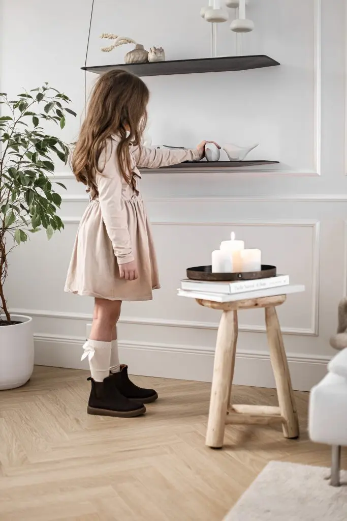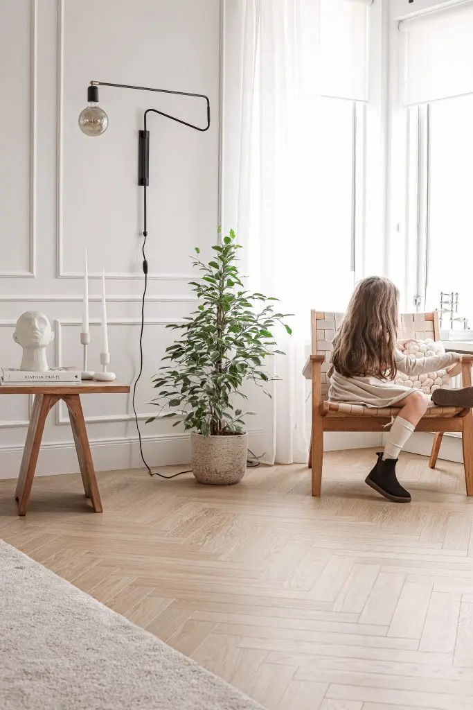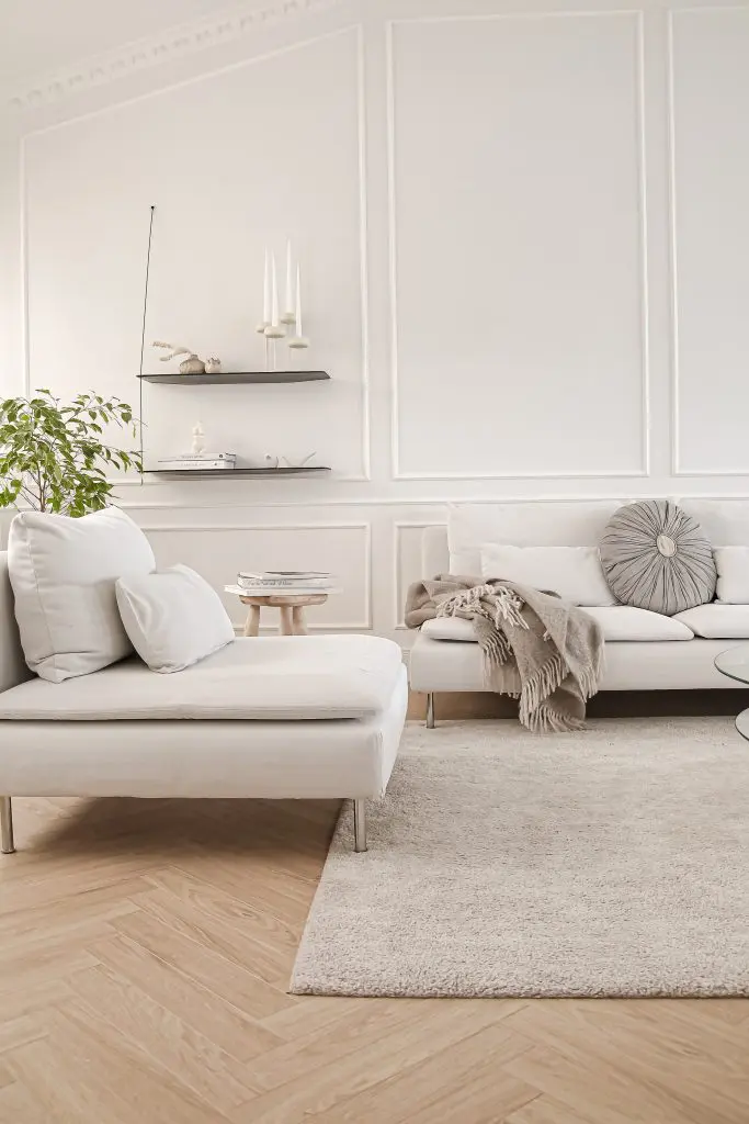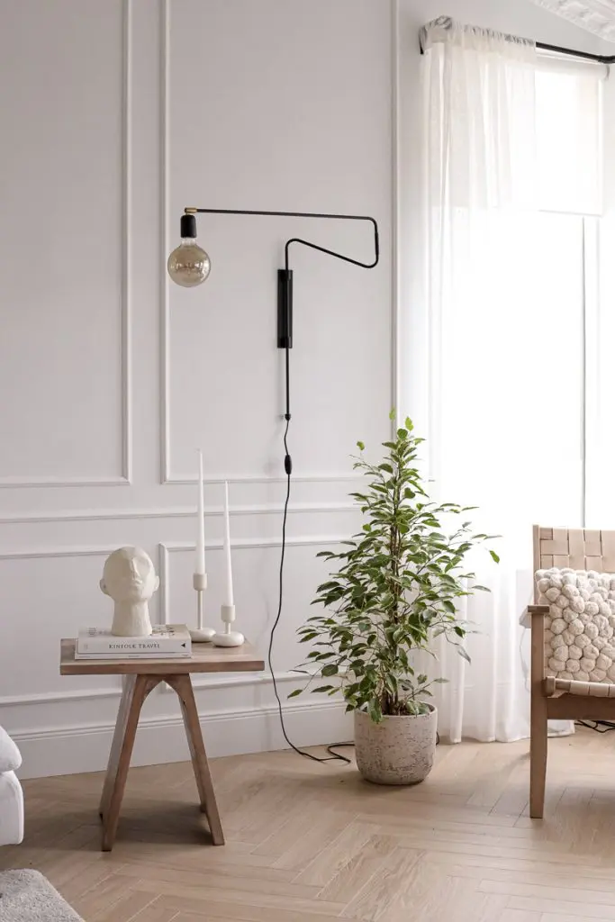 Ég valdi að hafa einungis ramma á efri og neðri part á stóra stofuveggnum en bara neðri part á öðrum stöðum. Til að útkoman yrði ekki of yfirþyrmandi á stofuveggnum notaði ég mjóa lista.