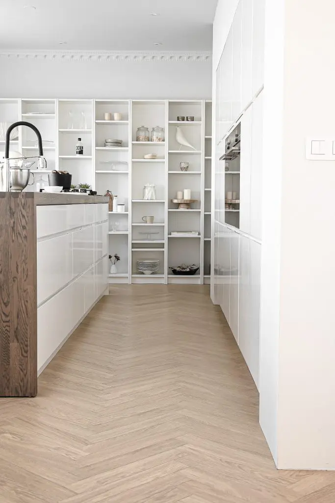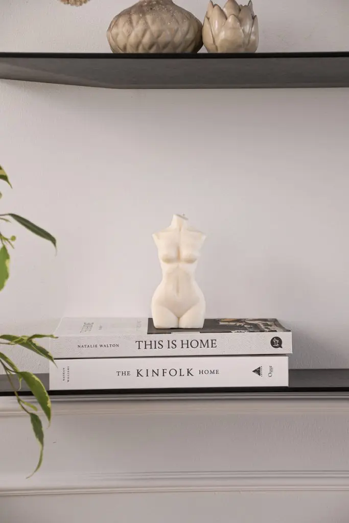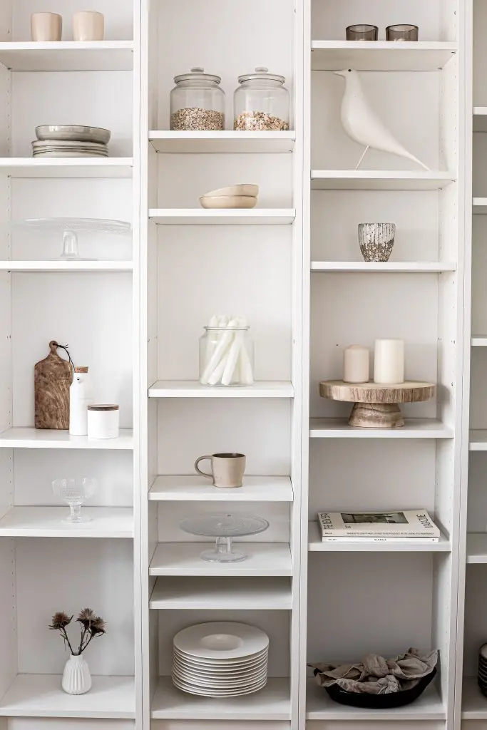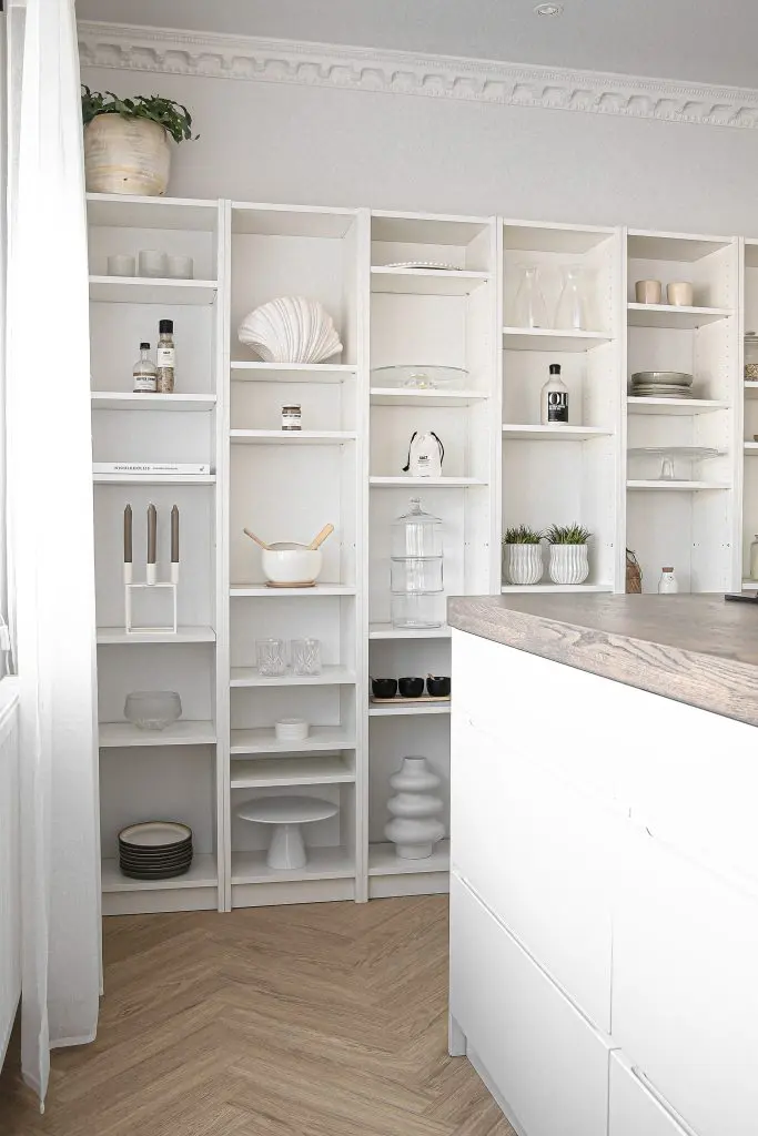 Í hillunum í eldhúsinu breytti ég pilleríinu og fór í meiri jarðtóna og hlýleika, til að tengja saman eldhús og stofustíl.