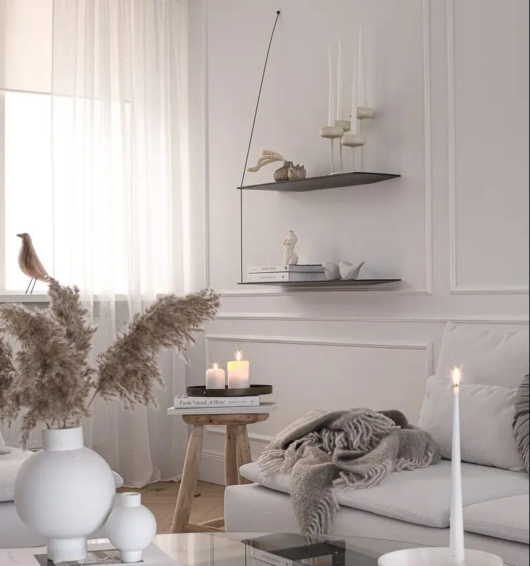 Ég valdi að hafa einungis ramma á efri og neðri part á stóra stofuveggnum en bara neðri part á öðrum stöðum. Til að útkoman yrði ekki of yfirþyrmandi á stofuveggnum notaði ég mjóa lista.