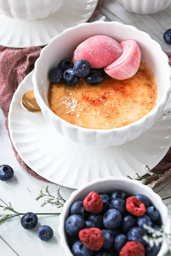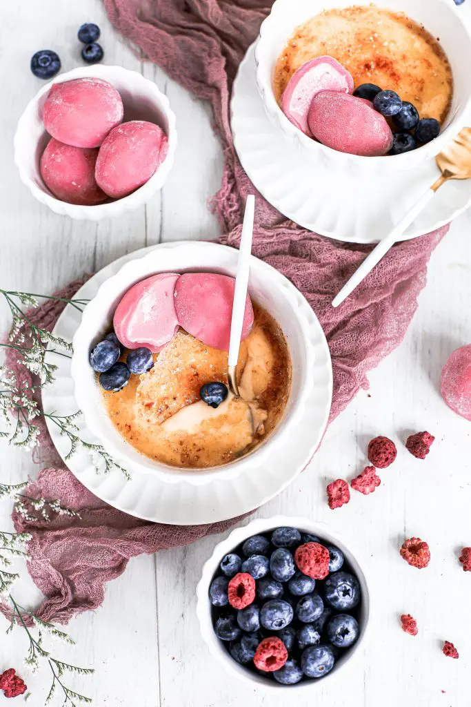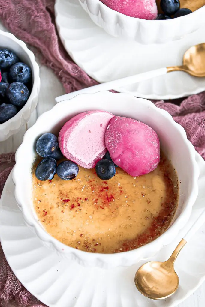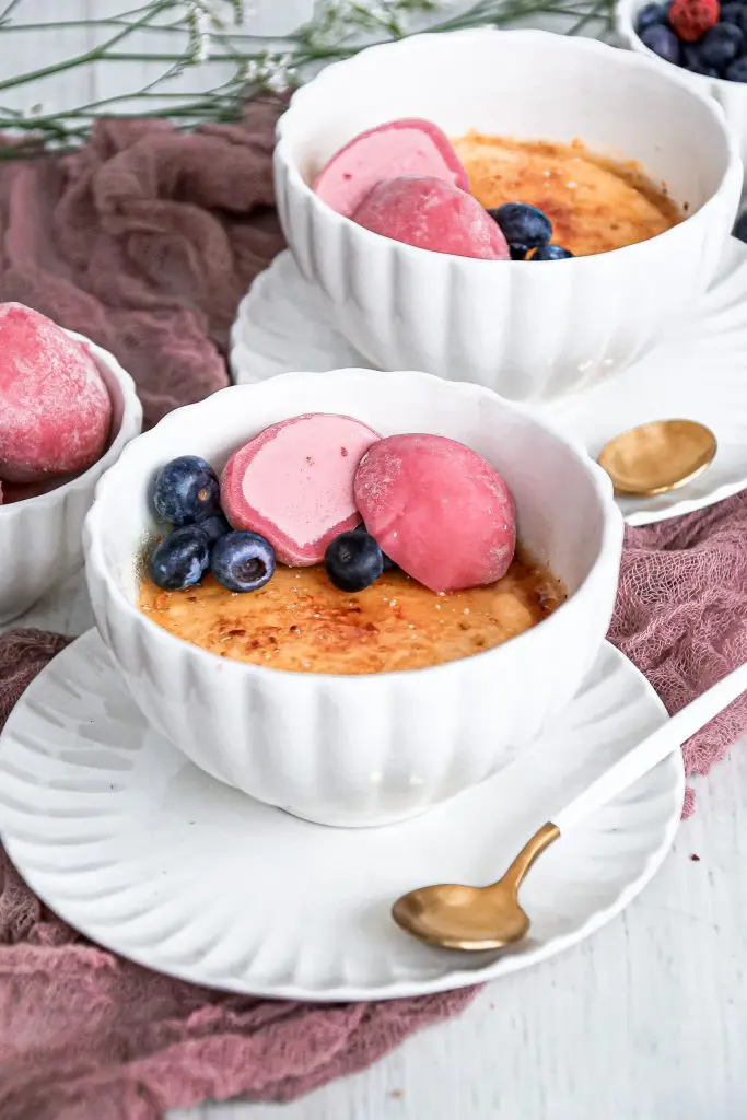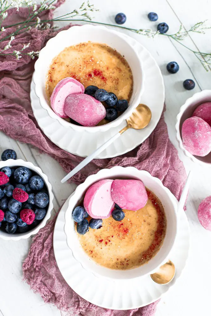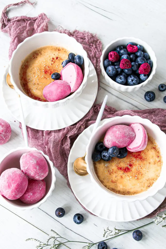 - Þegar á að bera réttinn fram sáldrið þá eins og 1-2 tsk af sykri yfir hverja skál og brennið sykurinn með brennara og látið eins og 1-2 little Moons ískúlur með rifsberjabragði ofan á og njótið