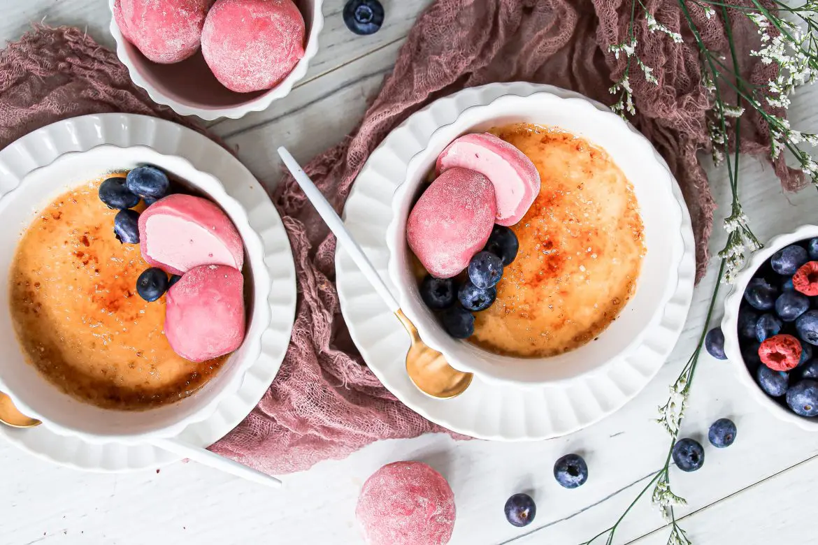 - Þegar á að bera réttinn fram sáldrið þá eins og 1-2 tsk af sykri yfir hverja skál og brennið sykurinn með brennara og látið eins og 1-2 little Moons ískúlur með rifsberjabragði ofan á og njótið