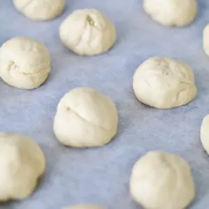 - Gerið 25-30 stk af kúlum eftir því hversu stór þið viljið hafa brauðin. Ég gerði litlar kúlur og ýtti ögn ofan á þær til að fletja smá út. Leyfið þeim svo að standa undir stykki í 10 mínútur áður en þær fara inn í ofn.