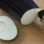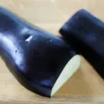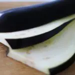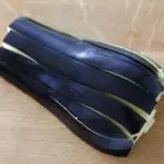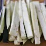 - Hér fyrir ofan á myndunum sjáið þið hvernig ég byrja á að skera botninn og toppinn af eggaldinu. Næst sker ég það svo í tvennt langsum, og svo hvern helming í 3 skífuparta. Svo læt ég alla þrjá partana leggjast saman og sker í langar ræmur/franskar.