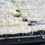 - Raðið hverri frönsku fyrir sig á grind (helst ekki setja á ofnplötu með bökunarpappír). Ég set ofngrindina ofan á ofnskúffuna og baka þær þannig (getið séð hvernig á mynd hér að neðan). Það er allt í góðu að raða þeim þétt saman.