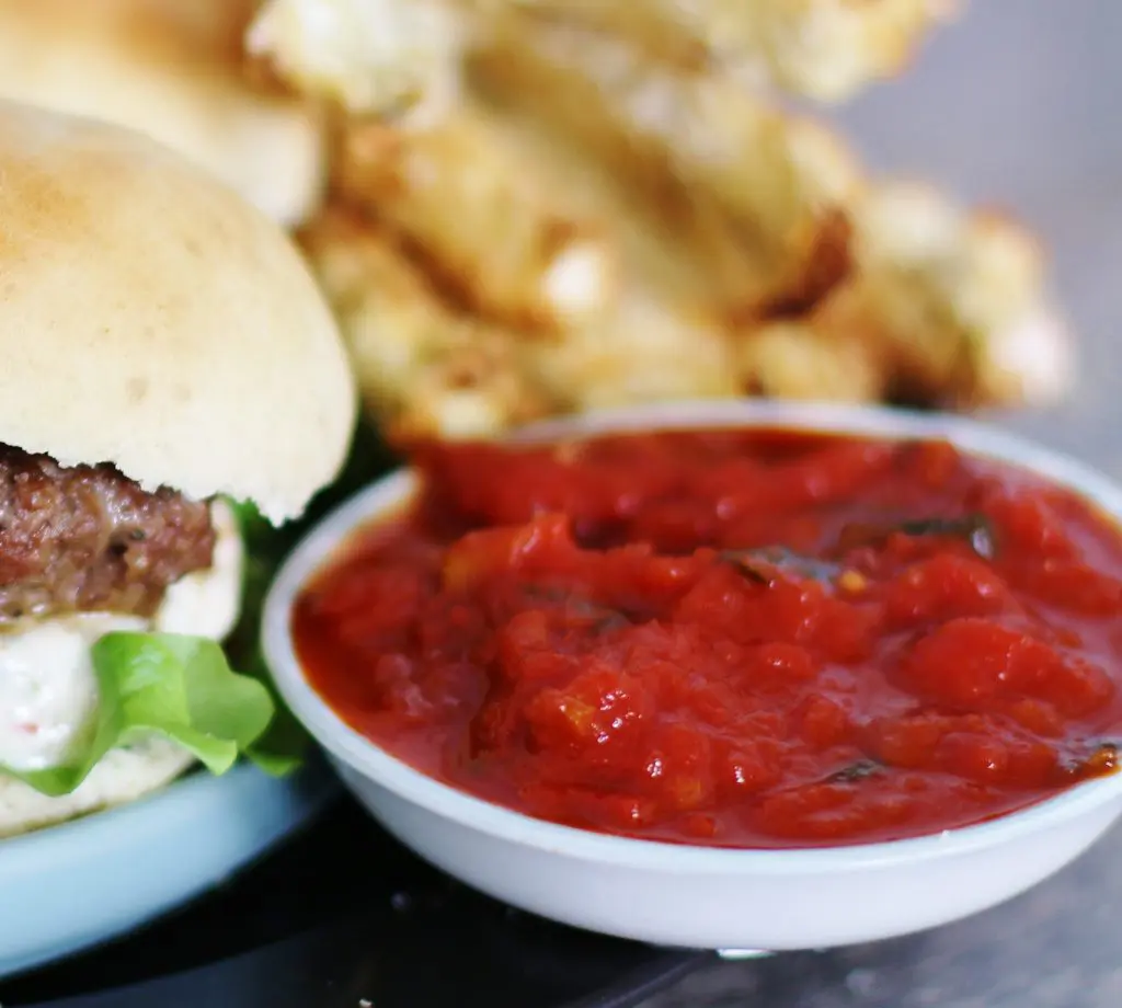 - Berist fram með tómatbasilsósunni til að dýfa í…..namm ómótstæðilega gott.