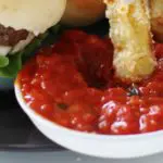 Franskarnar einar og sér eru geggjaðar en best er að hafa með þeim dásamlega góðri tómatbasilsósu til að dýfa í. Ekki láta blekkjast þó þær séu gerðar úr eggaldin því þær eru bilað góðar og mega crunchy.
