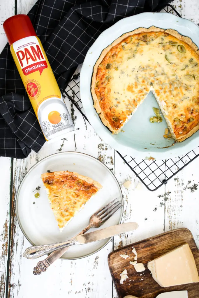 Ekki samt spreyja of mikið af því, þar sem það er smjör í skorpunni og þá gæti þetta orðið of feitt. Notið bara ef þið hyggist taka hana úr mótinu, eins og smellukökuformi eða slíku og setja hana á annað fat.