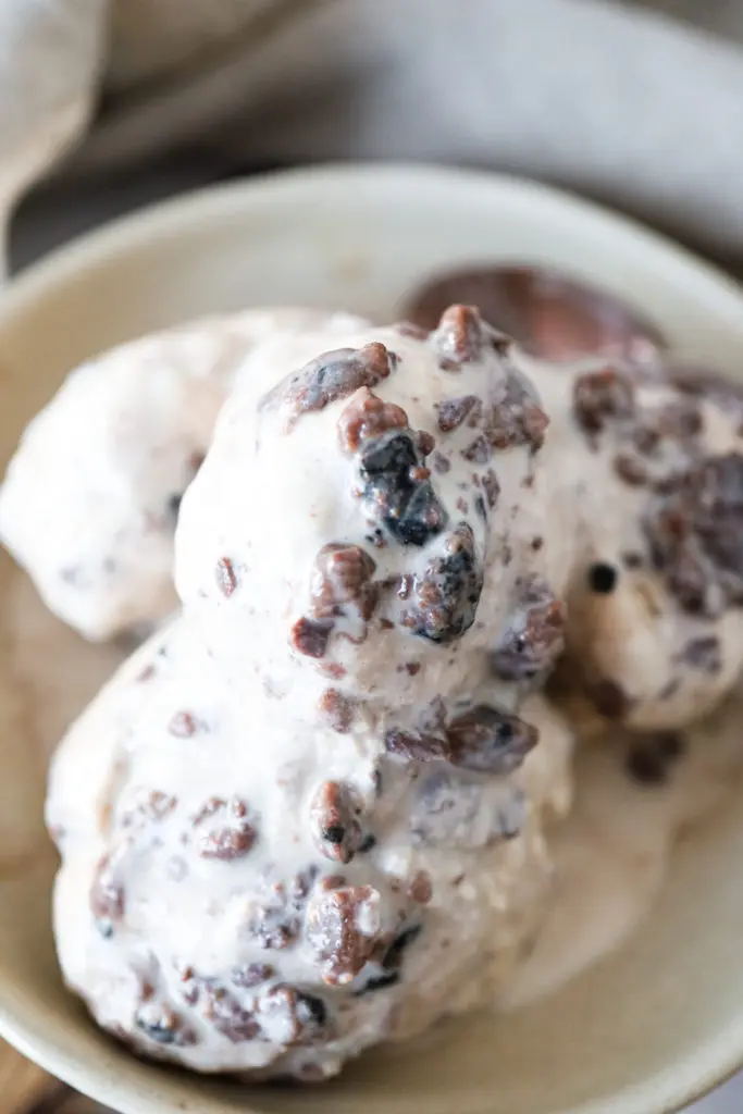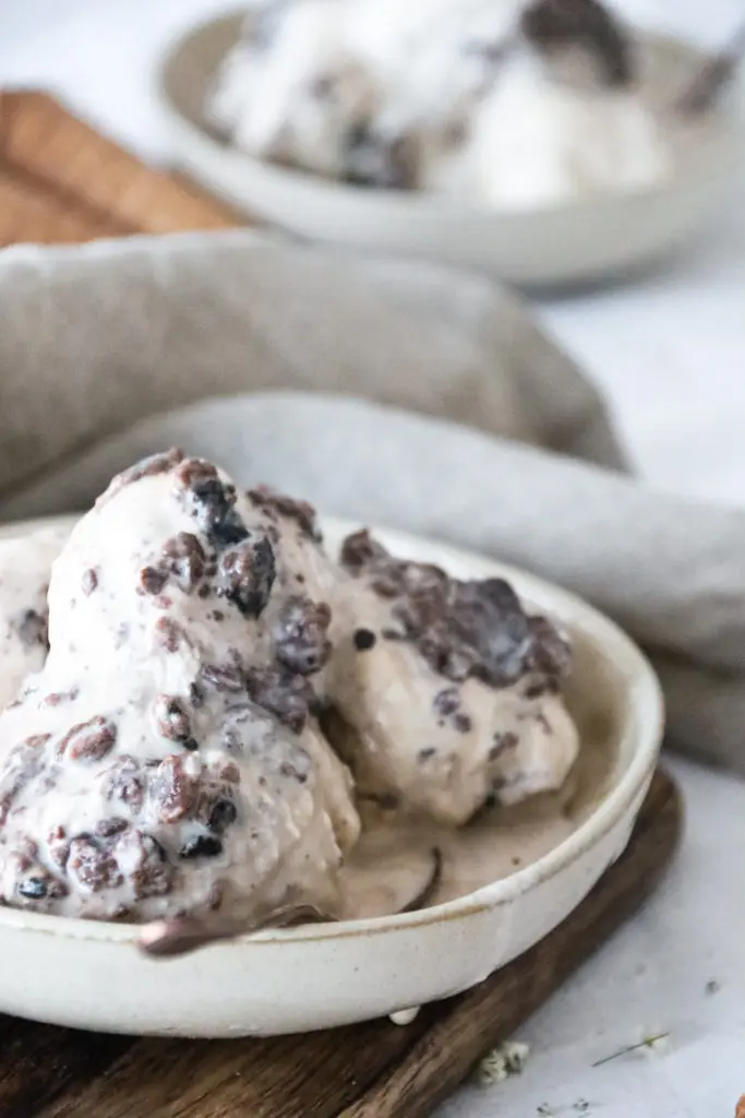 Þar sem ísinn er frekar þunnur ófrosin á mylsnan það til að falla á botninn, þess vegna er gott þegar þið skafið með ísskeið að fara alveg neðst á botninn til að fá þrista með í hverri kúlu.