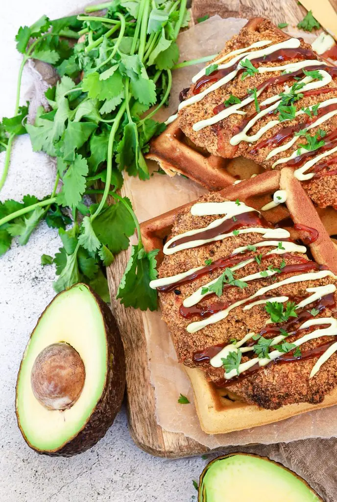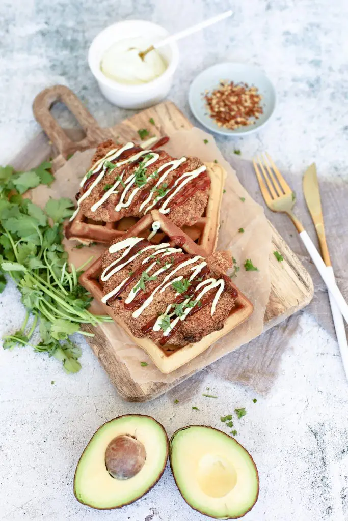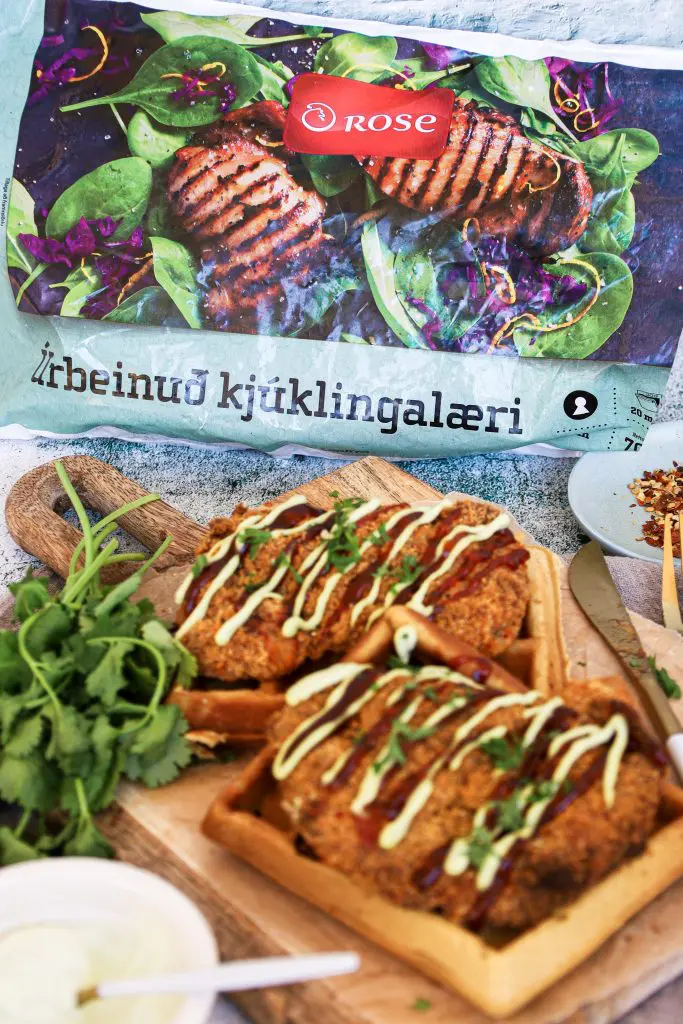 Þetta er alls ekki flókið en hér geri ég allt frá grunni, vöfflurnar, avókadó sósuna og kjúllann, en mér finnst voða gott að eiga kjúkling í frystir frá Rose poultry.