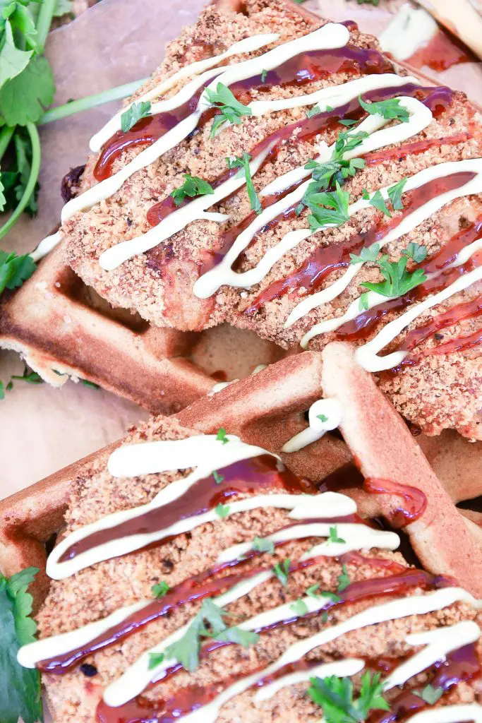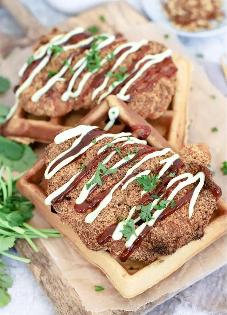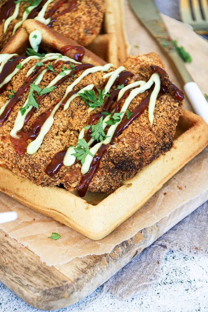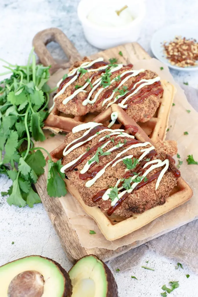 Best er að gera réttinn í þessari röð; vöffludeig, kjúklinginn, sósuna meðan kjúllinn er í ofninum og baka svo vöfflurnar þegar kjúklingurinn er kominn úr ofninum.