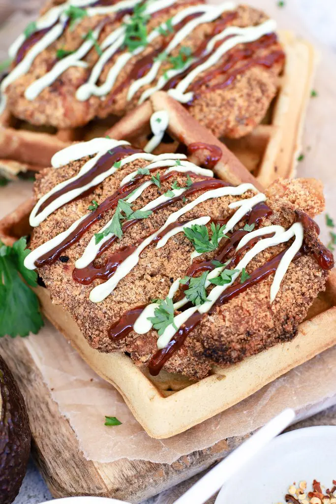 Vaffla með stökkum kjúkling BBQ sósu og avókadó-hvítlaukssósu, og guð minn hvað mér fannst það gott.
