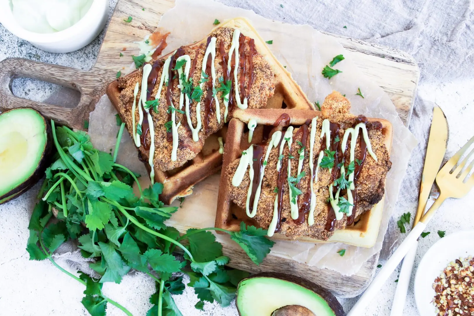 Þetta er alls ekki flókið en hér geri ég allt frá grunni, vöfflurnar, avókadó sósuna og kjúllann, en mér finnst voða gott að eiga kjúkling í frystir frá Rose poultry.