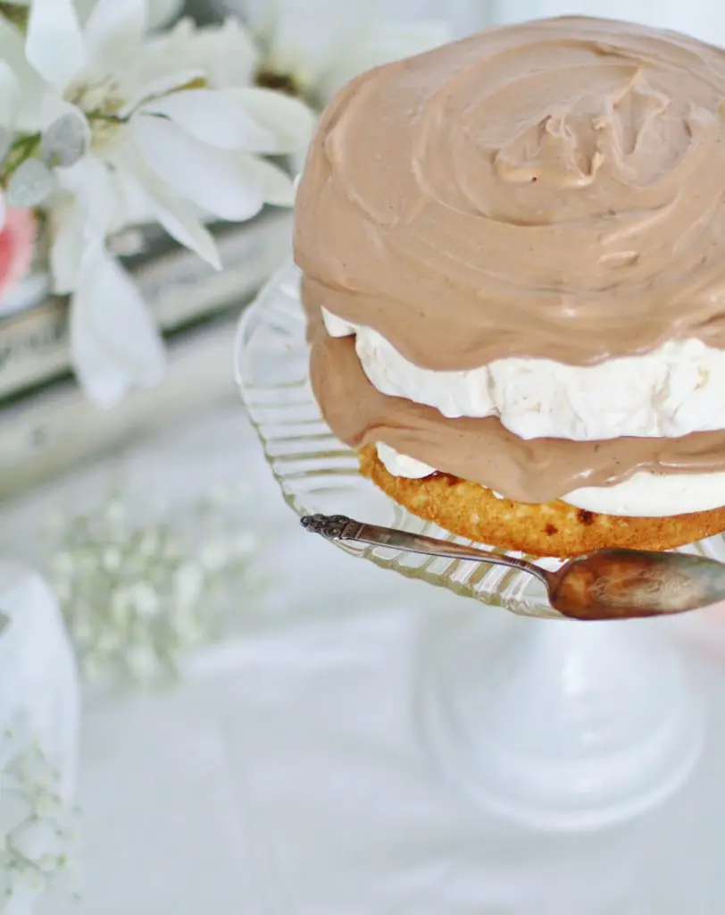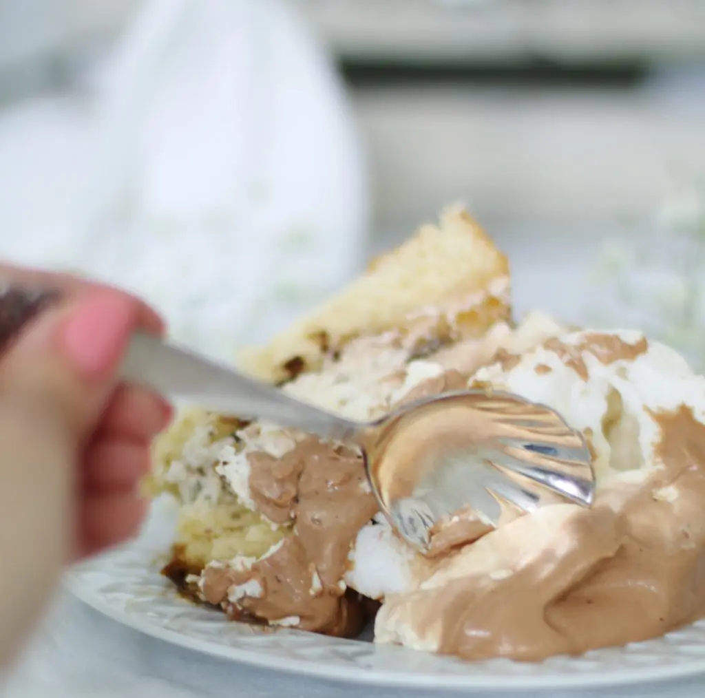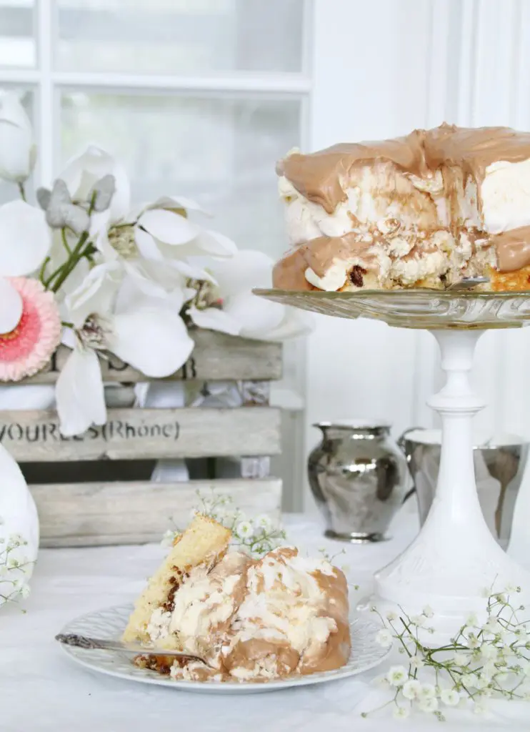 Ég set niðurskorið Pralín súkkulaði með karamellufyllingu í svampbotnin, og trúið mér það er geggjað gott. Það gefur manni svona aðeins meira til að tyggja en annars er kakan það mjúk að hún líkist smá súkkulaðifrauði.